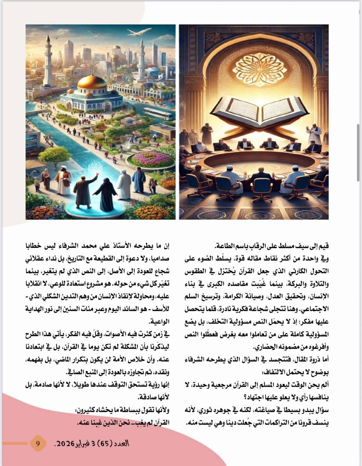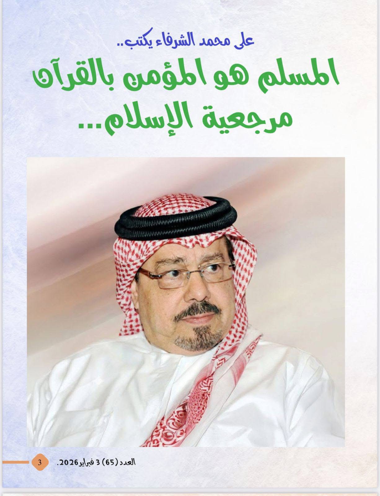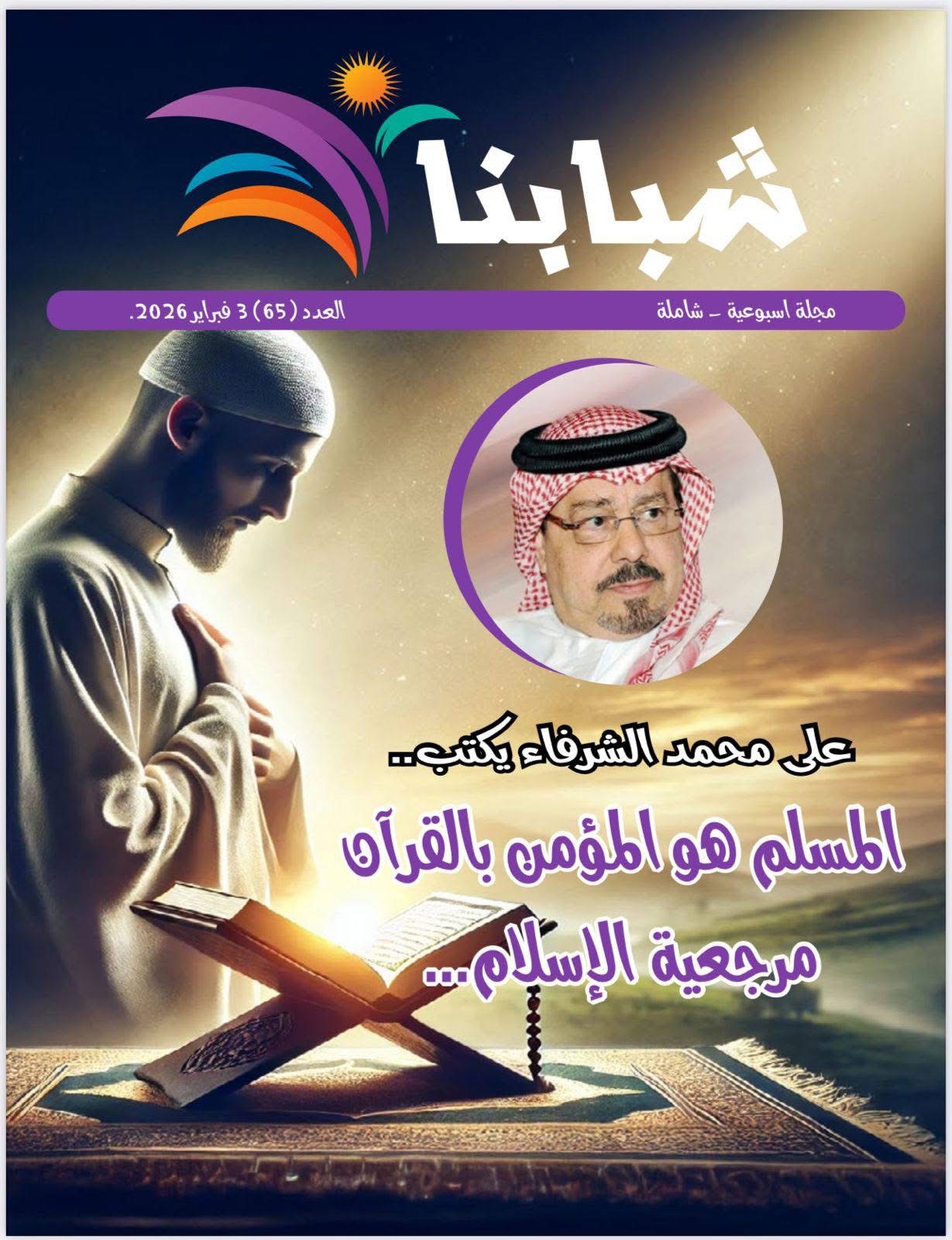 صدر اليوم الثلاثاء 3 فبراير 2026، العدد الجديد من مجلة شبابنا الصادرة عن مؤسسة " رسالة السلام " حاملاً مقالات غنية بالتحليل والفكر الراقي، وأبرزها مقال الأستاذ علي الشرفاء الحمادي بعنوان : المسلم هو المؤمن بالقرآن مرجعية الإسلام " .