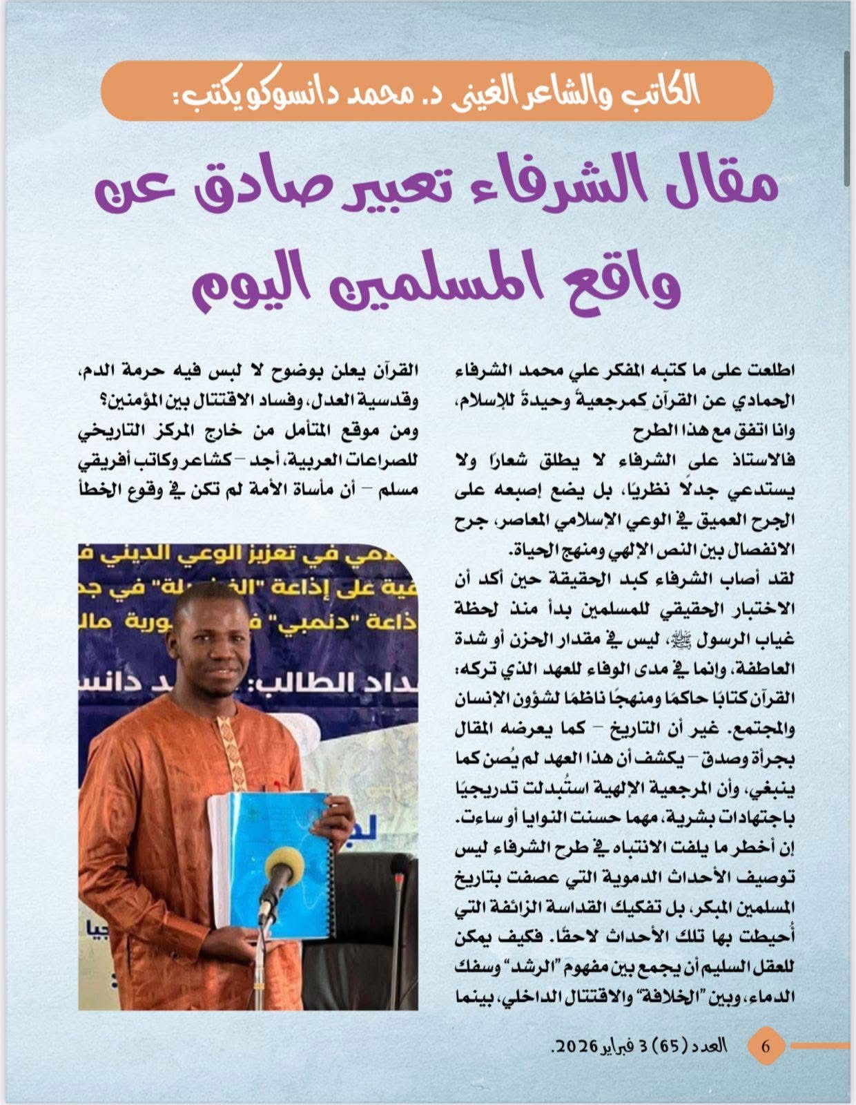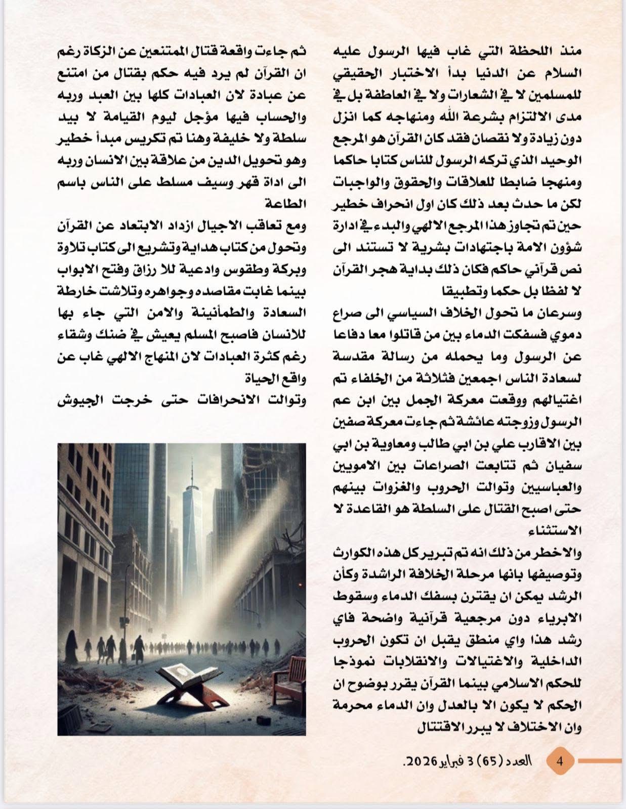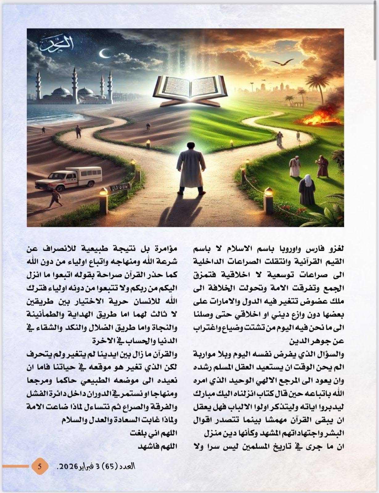 صدر اليوم الثلاثاء 3 فبراير 2026، العدد الجديد من مجلة شبابنا الصادرة عن مؤسسة " رسالة السلام " حاملاً مقالات غنية بالتحليل والفكر الراقي، وأبرزها مقال الأستاذ علي الشرفاء الحمادي بعنوان : المسلم هو المؤمن بالقرآن مرجعية الإسلام " .
