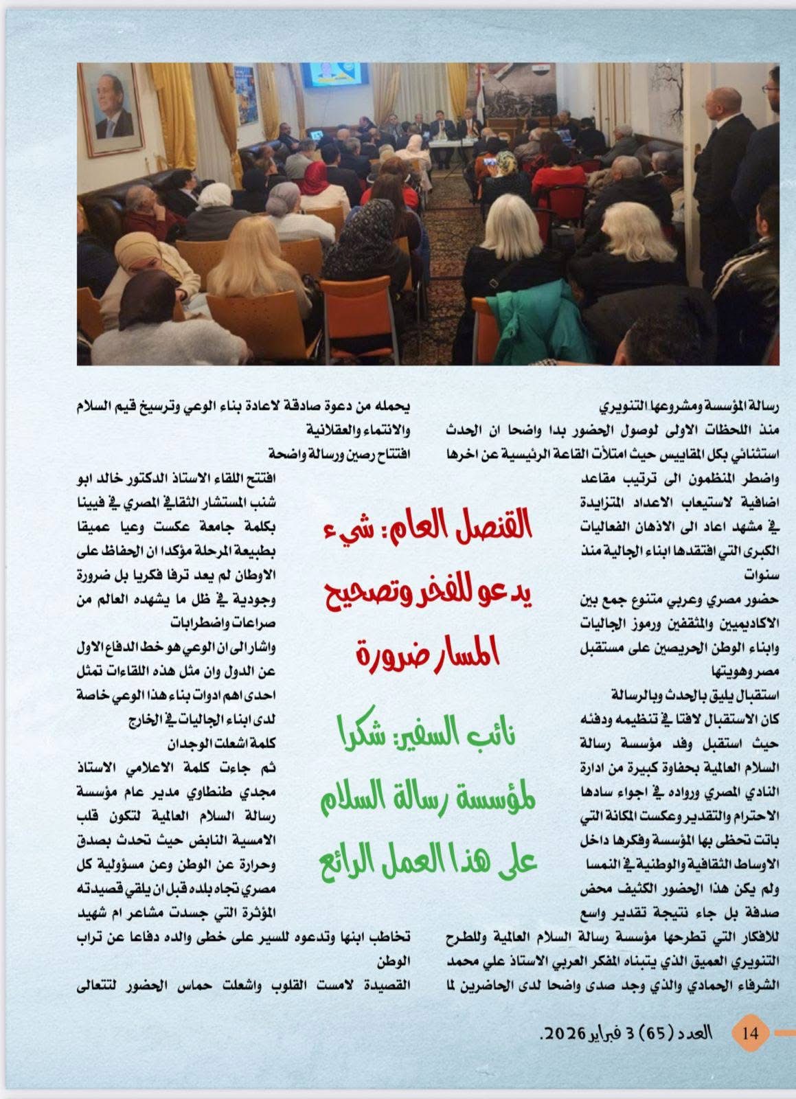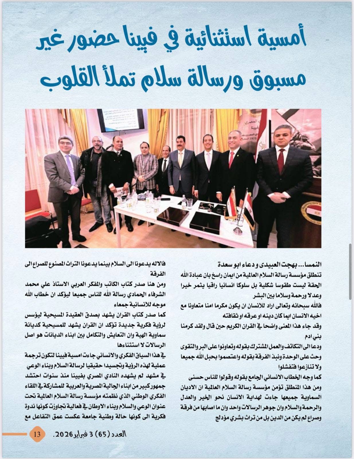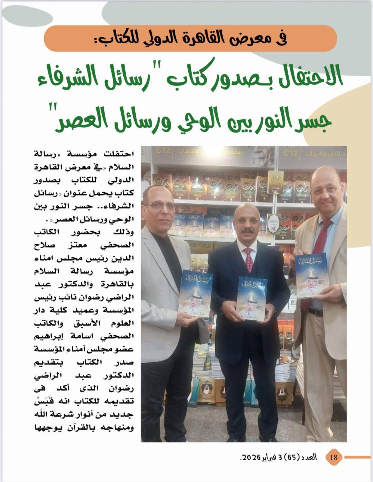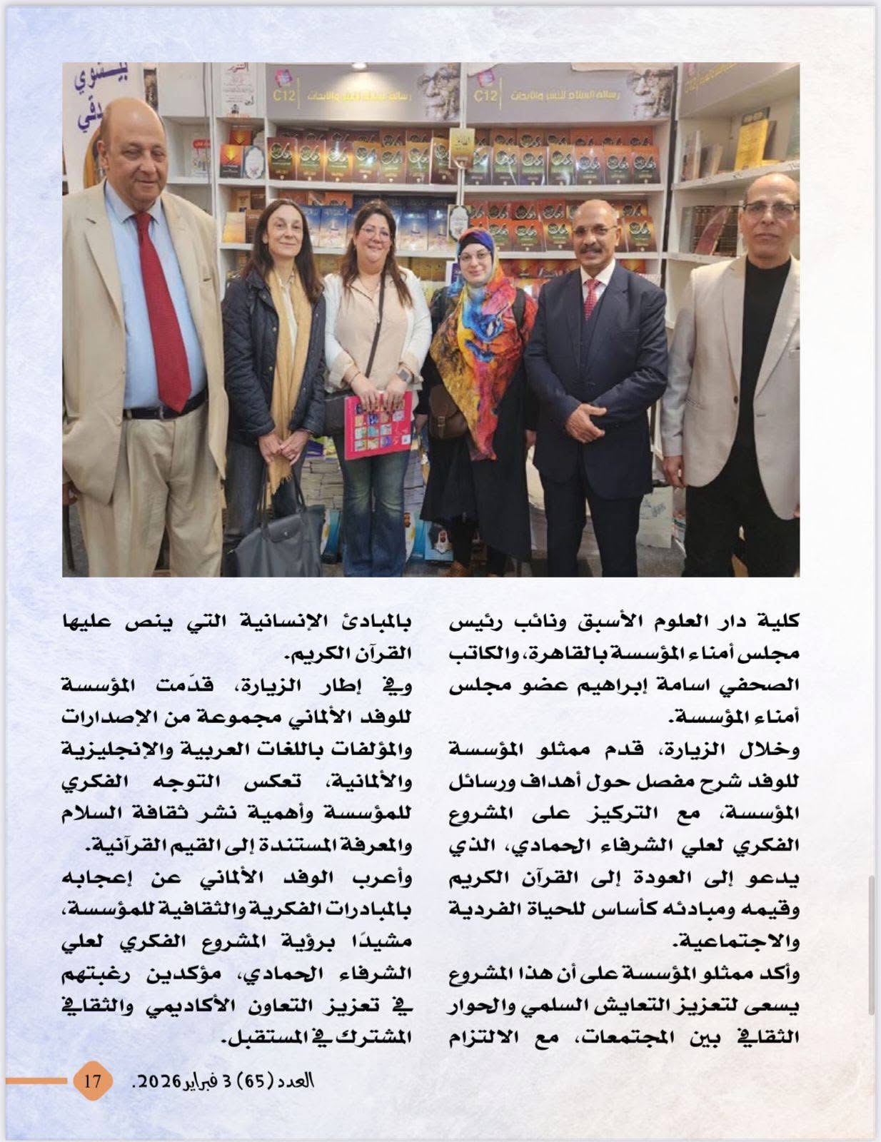 الجدير بالذكر ان رئيس تحرير المجلة هو الكاتب الصحفي الدكتور معتز صلاح الدين رئيس مجلس أمناء مؤسسة رسالة السلام بالقاهرة والذي أشرف على إخراج العدد بما يليق برؤية المؤسسة ورسالتها في نشر الفكر الإسلامي الوسطي والمستنير .