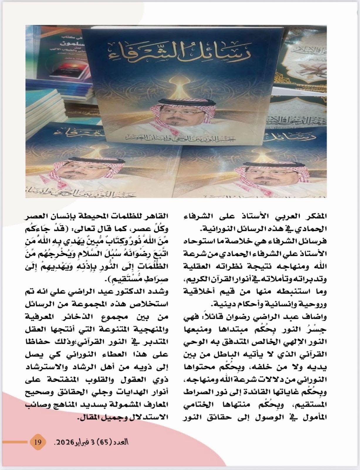 وتحتفل المجلة في معرض القاهرة الدولي للكتاب بصدور كتاب " رسائل الشرفاء .. جسر النور بين الوحي ورسائل العصر " والذي يعد ترجمة حية لرؤية الشرفاء الحمادي في الارتكاز على القرآن كمرجعية أساسية لبناء مجتمع عادل ومتوازن .