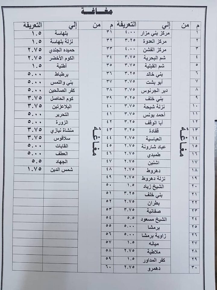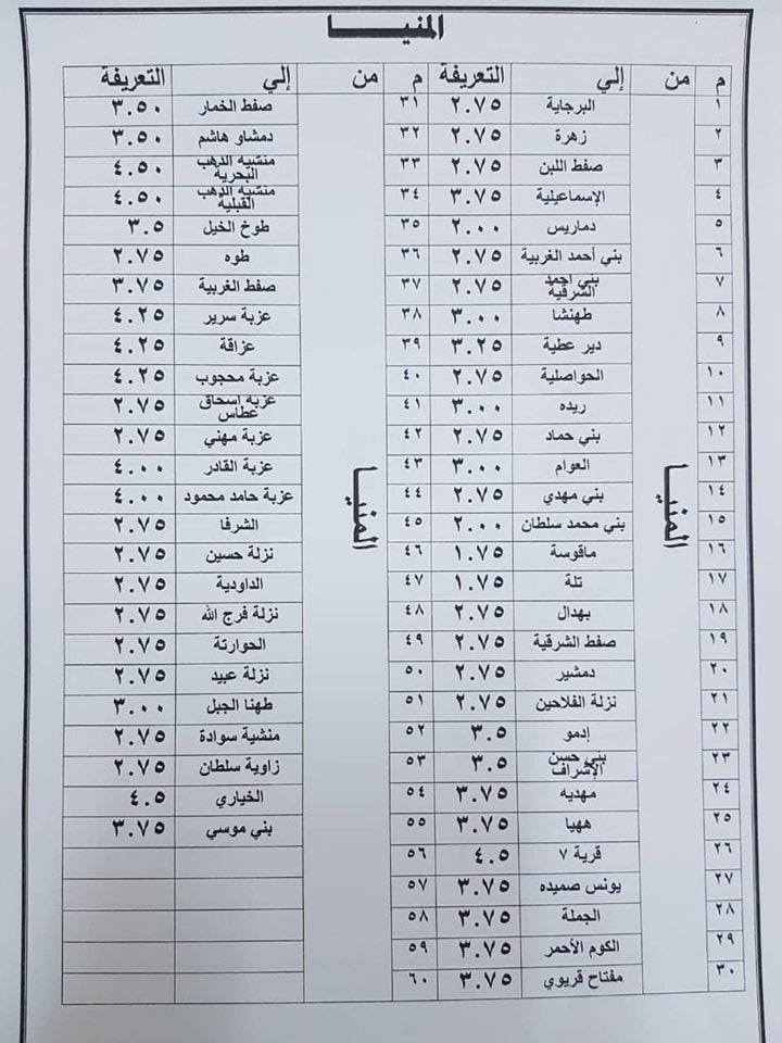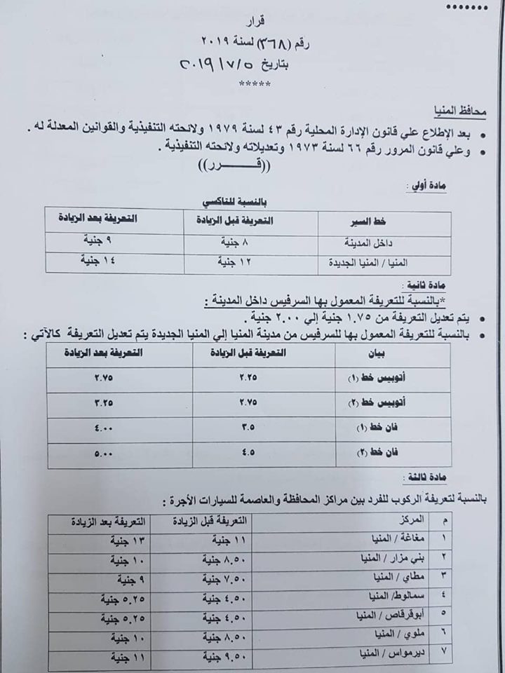 اعتمد اللواء قاسم حسين، محافظ المنيا، الزيادة الجديدة لتعريفة الأجرة للنقل الداخلي وبين المحافظات، وكذلك بين المراكز والقرى التابعة لها، وتعريفة التاكسي داخل مدينة المنيا، وتعريفة سيارات السرفيس داخل المدينة.