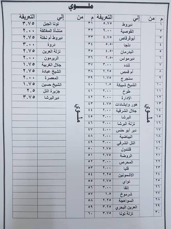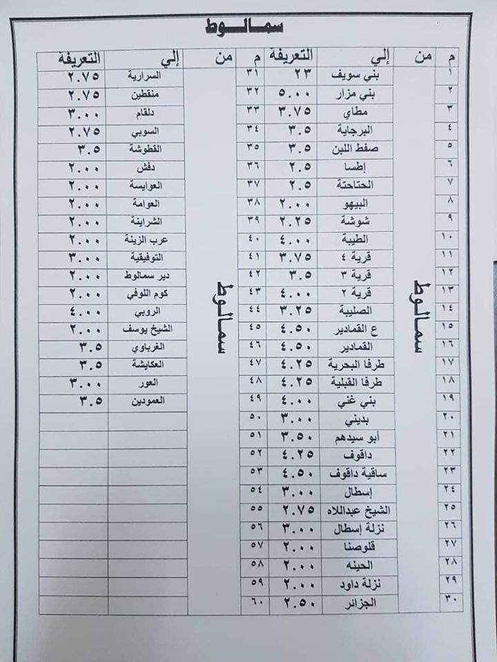 وأضاف أنه فيما يخص سيارات مشروع النقل الجماعي التابعة للمحافظة فيتم العمل بذات التعريفة للسرفيس داخل المدينة وبين مدن المحافظة /القاهرة – بين محافظتي اسيوط وبني سويف –بين مراكز المحافظة والعاصمة للسيارات الاجرة.