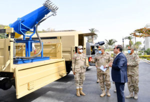 فى إطار مُساهمة القوات المسلحة لمعاونة القطاع المدنى بالدولة لمكافحة انتشار فيروس كورونا المُستجد، تفقد الرئيس عبد الفتاح السيسى اليوم بعض نماذج من أجهزة ومعدات التطهير والتعقيم التى تم تطويرها بالتعاون مع وزارة الدولة للإنتاج الحربى، وذلك للاستخدام فى أعمال التطهير لمنشآت ومؤسسات الدولة عن طريق استخدام أحدث المواد والمحاليل الكيميائية فى هذا المجال وطبقًا لمواصفات وتوصيات منظمة الصحة العالمية".