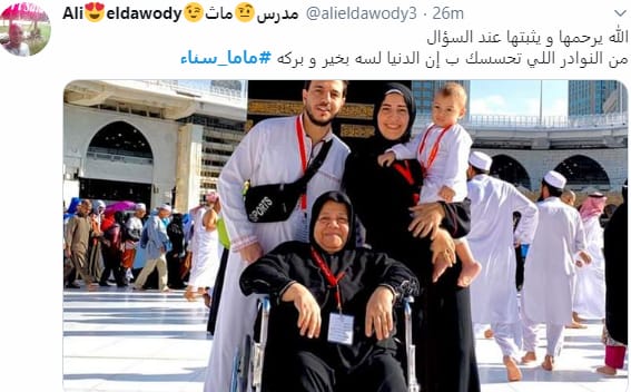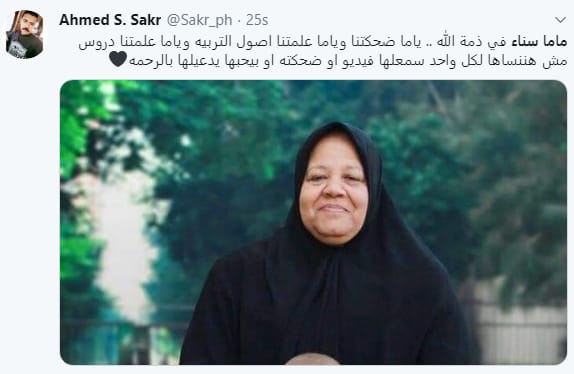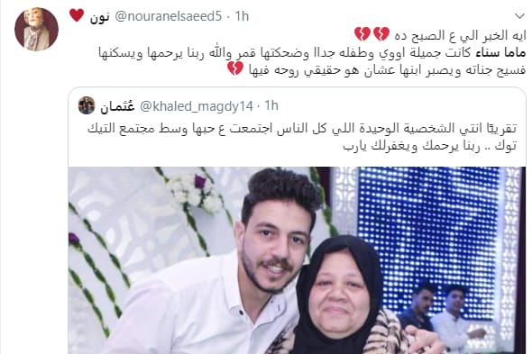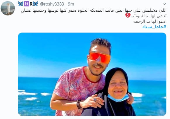 أعلن حمو نجل «ماما سناء» وفاتها منذ قليل وذلك من خلال صفحاته الشخصية على مواقع التواصل الاجتماعي «امي في ذمة الله ماما سناء توفت ي جماعة ادعو لها بالرحمة» وحققت والداه حمو شهرة واسعة في الوطن العربي وحزن جميع المتابعين لفيديوهات «ماما سناء» بعد معرفتهم خبر وفاتها ودعي لها الجميع بالرحمة والمغفرة وخصوصا بعد إعلام حمو متابعيها بموعد دفنها «الدفنة بعد صلاة الظهر في جامع الانوار المحمدية اخر شارع الرحمة»