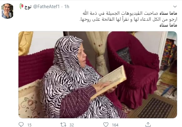 تحولت وانتابت صفحات التواصل الاجتماعي حالة حزن على وفاة اليوتيوبر الشهيرة « ماما سناء» وحزن كل المتابعين للفيديوهات على خبر وفاتها ورحيلها فدعي لها الجميع بلا استثناء بالرحمة والمغفرة وأن يسكنها الله فسيح جناته ومنها « الله يرحمها ويثبتها عند السؤال من النوادر اللي تحسيك إن الدنيا لسه بخير وبركة » ومنها «تقريبا انتي الشخصية الوحيدة اللي كل الناس اجتمعت على حبها وسط مجتمع التيك توك _ ربنا يرحمك ويعفرلك يارب » ، و« ماما سناء صاحبة الفيديوهات الجميلة في ذمة الله أرجو من الكل الدعاء لها ونقرأ لها الفاتحة على روحها» ، وأيضا « ماما سناء في ذمة الله_ ياما ضحكتنا وياما علمتنا أصول التربية وياما علمتنا دروس مس هننساها لكل واحد سمعلها فيديو أو ضحكة أو بيحبها يدعلها بالرحمة »