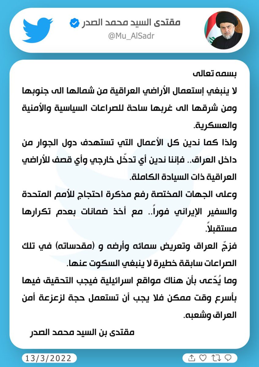 وقال الصدر في بيان علي تويتر: "لا ينبغي استعمال الأراضي العراقية من شمالها إلى جنوبها من شرقها إلي غربها ساحة للصراعات السياسية والأمنية والعسكرية."