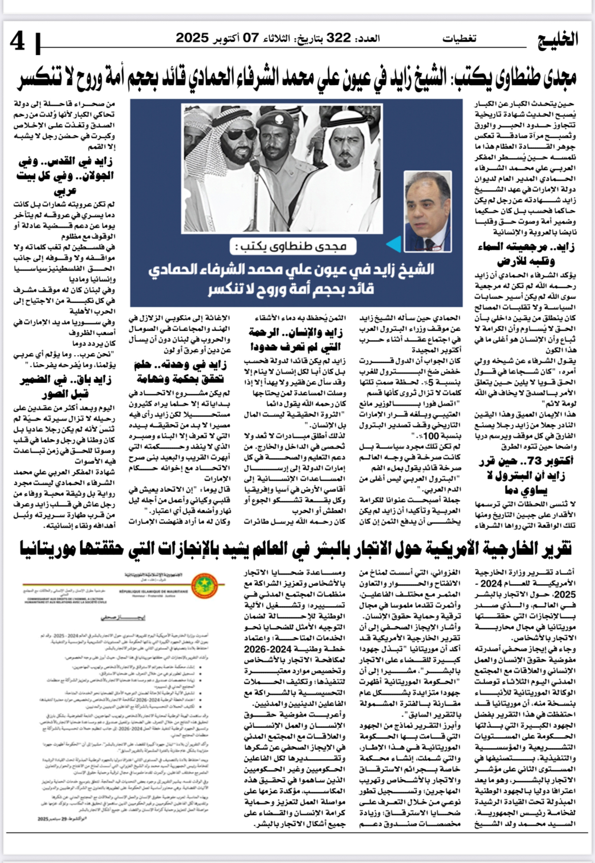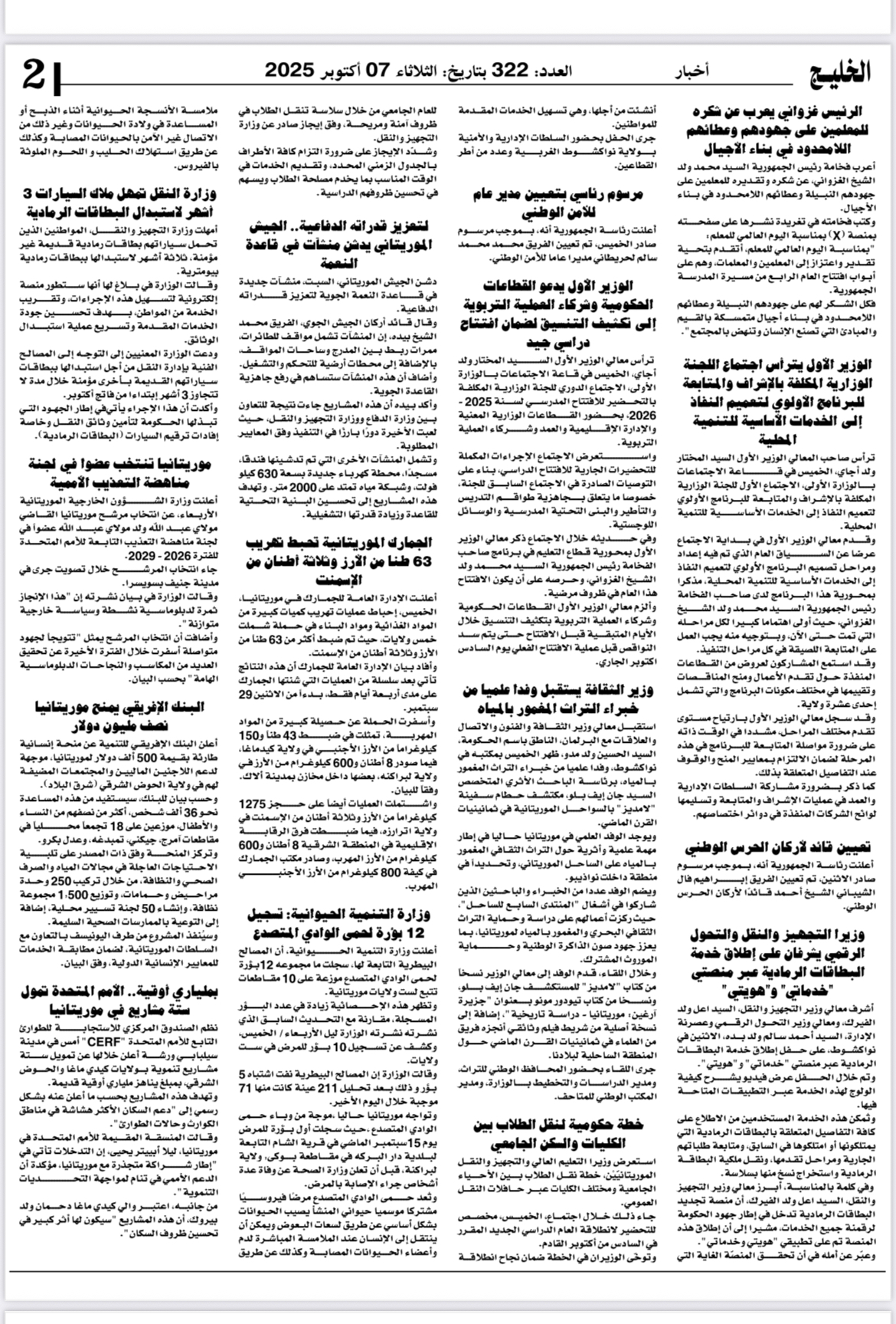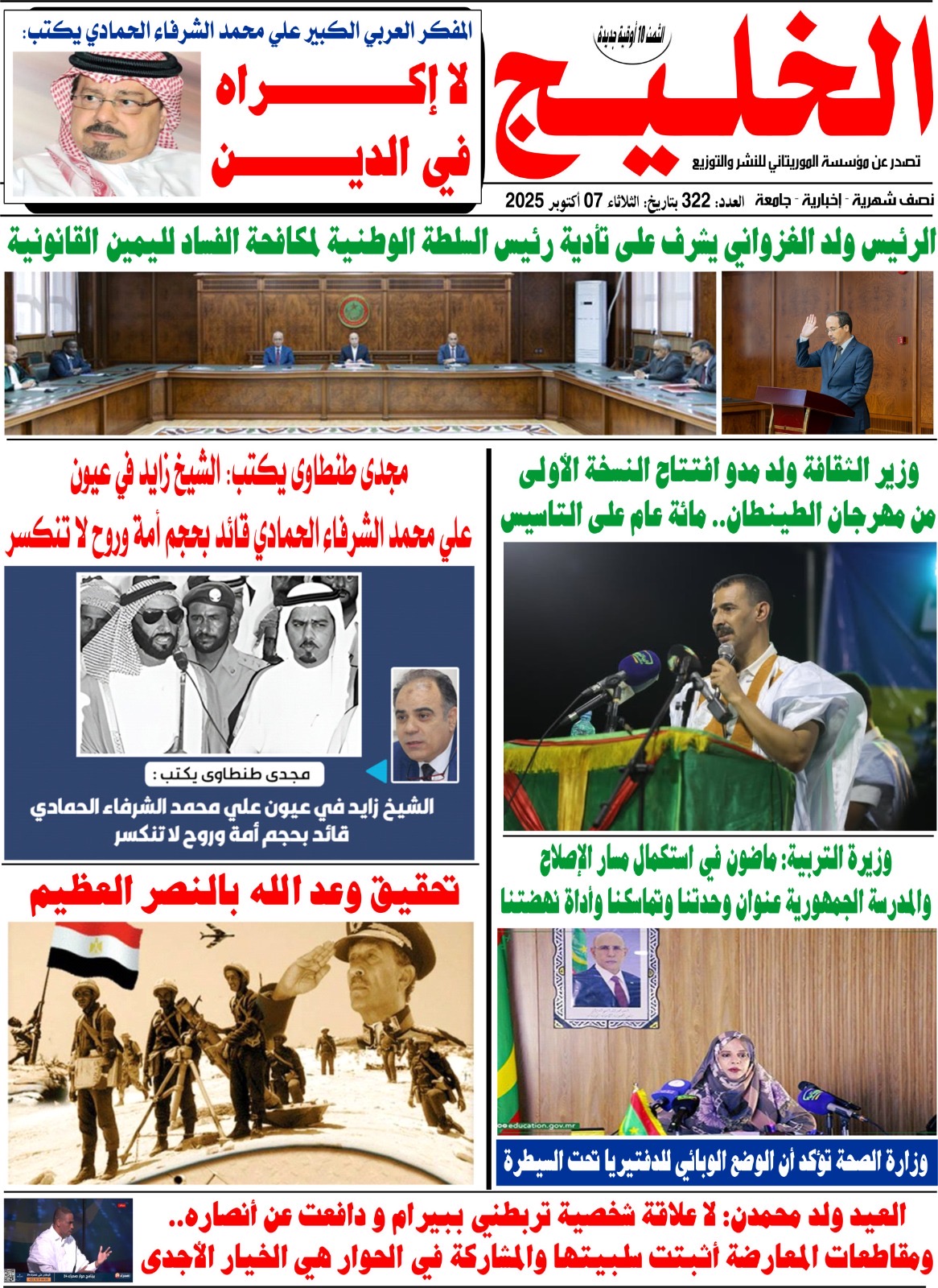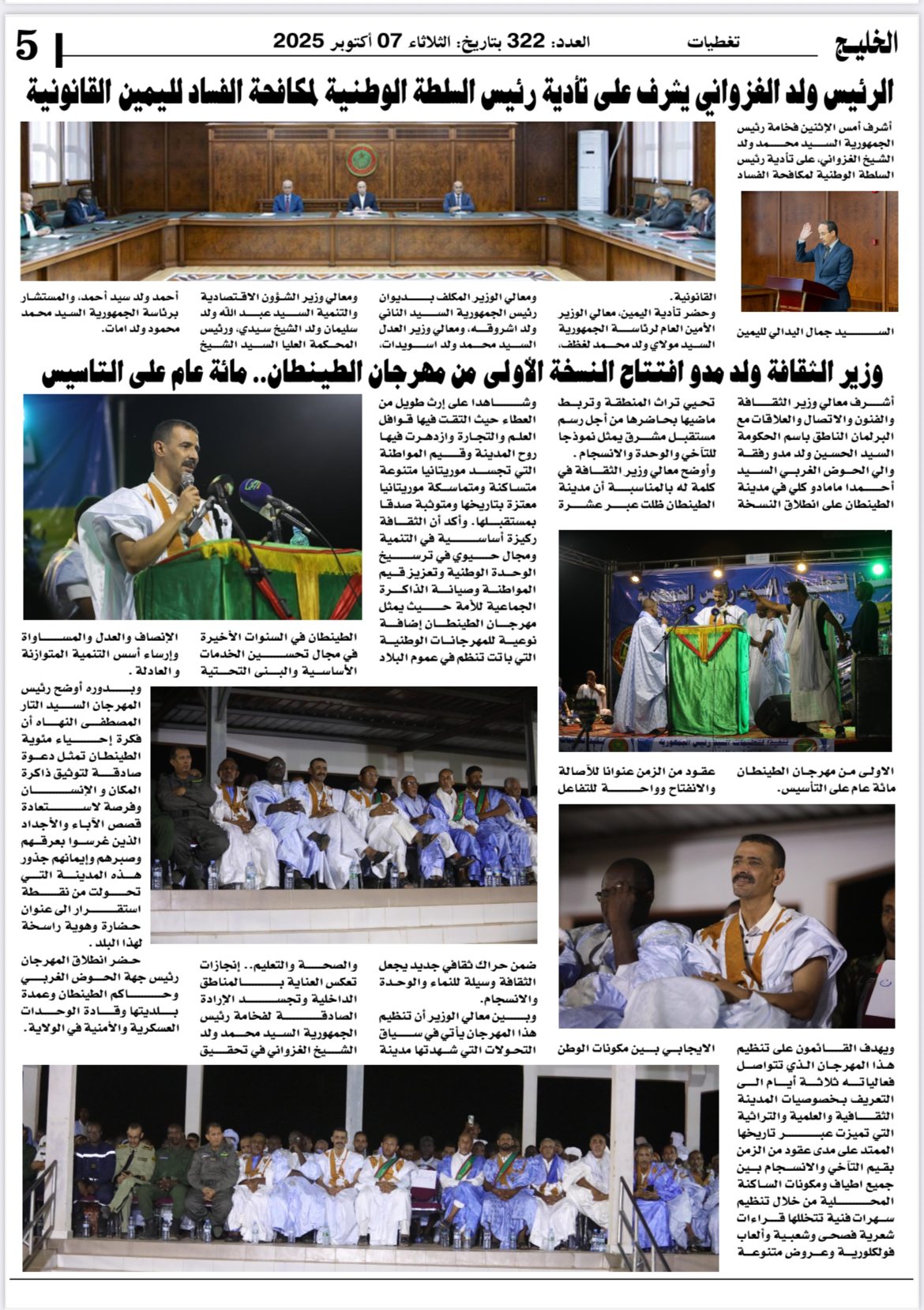 وفي تغطية للشأن الوطني، تضمن العدد تقرير عن إشراف الرئيس محمد ولد الشيخ الغزواني على أداء اليمين القانونية لرئيس السلطة الوطنية لمكافحة الفساد، وهي خطوة وُصفت بأنها تعزز التزام الدولة بالشفافية ومحاربة مظاهر الفساد المالي والإداري.