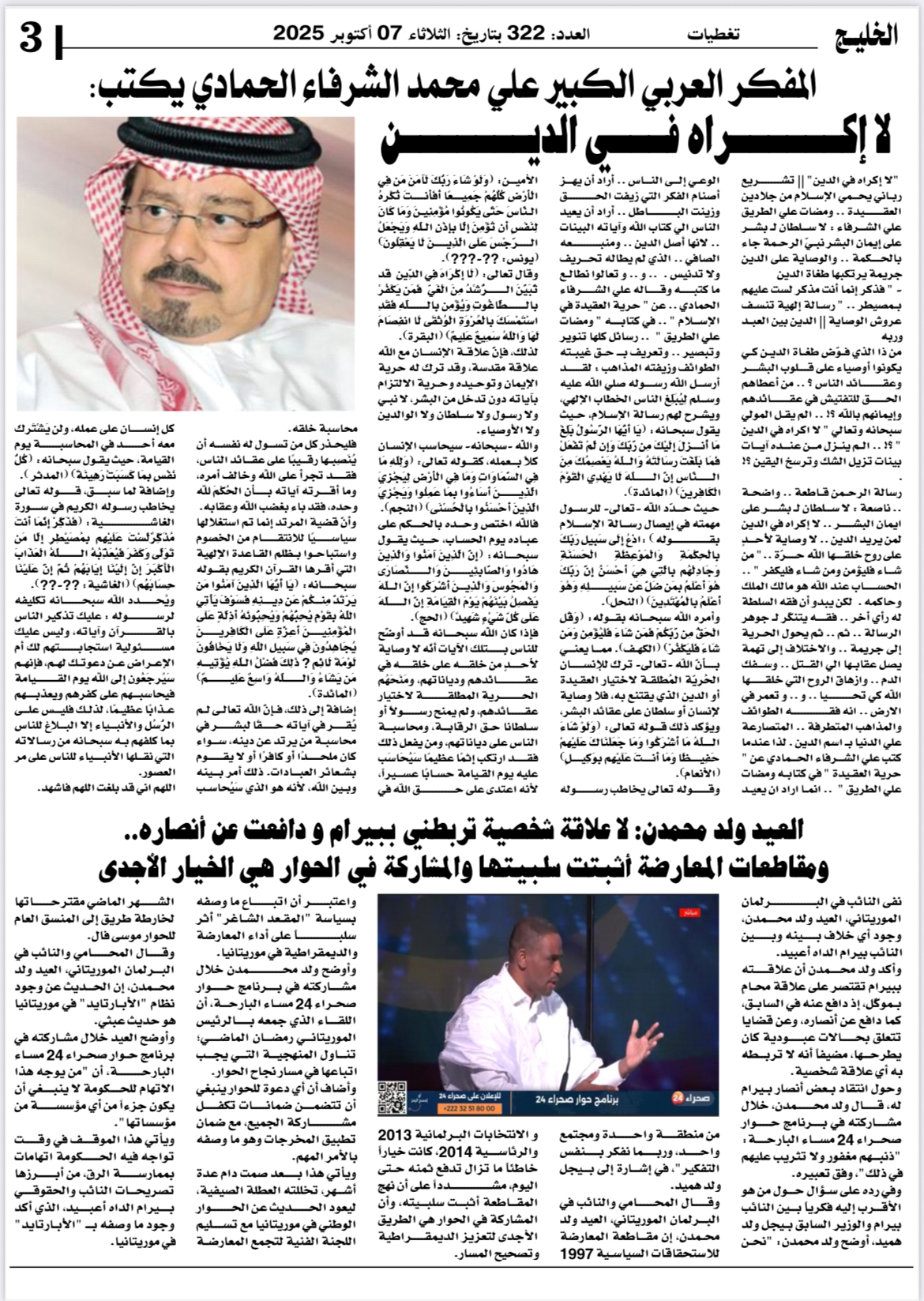 الجدير بالذكر ان العدد من مجلة الخليج يعكس تنوع في المحتوى، يوازن بين الفكر الإصلاحي التنويري، والتغطيات السياسية والثقافية والاجتماعية، مع تركيز لافت على أهمية الخطاب الديني المتسامح والجامع، كما عبّر عنه المفكر علي الشرفاء الحمادي، الذي يستمر في تقديم مشروع فكري يدعو للسلام، والعقل، والحرية .