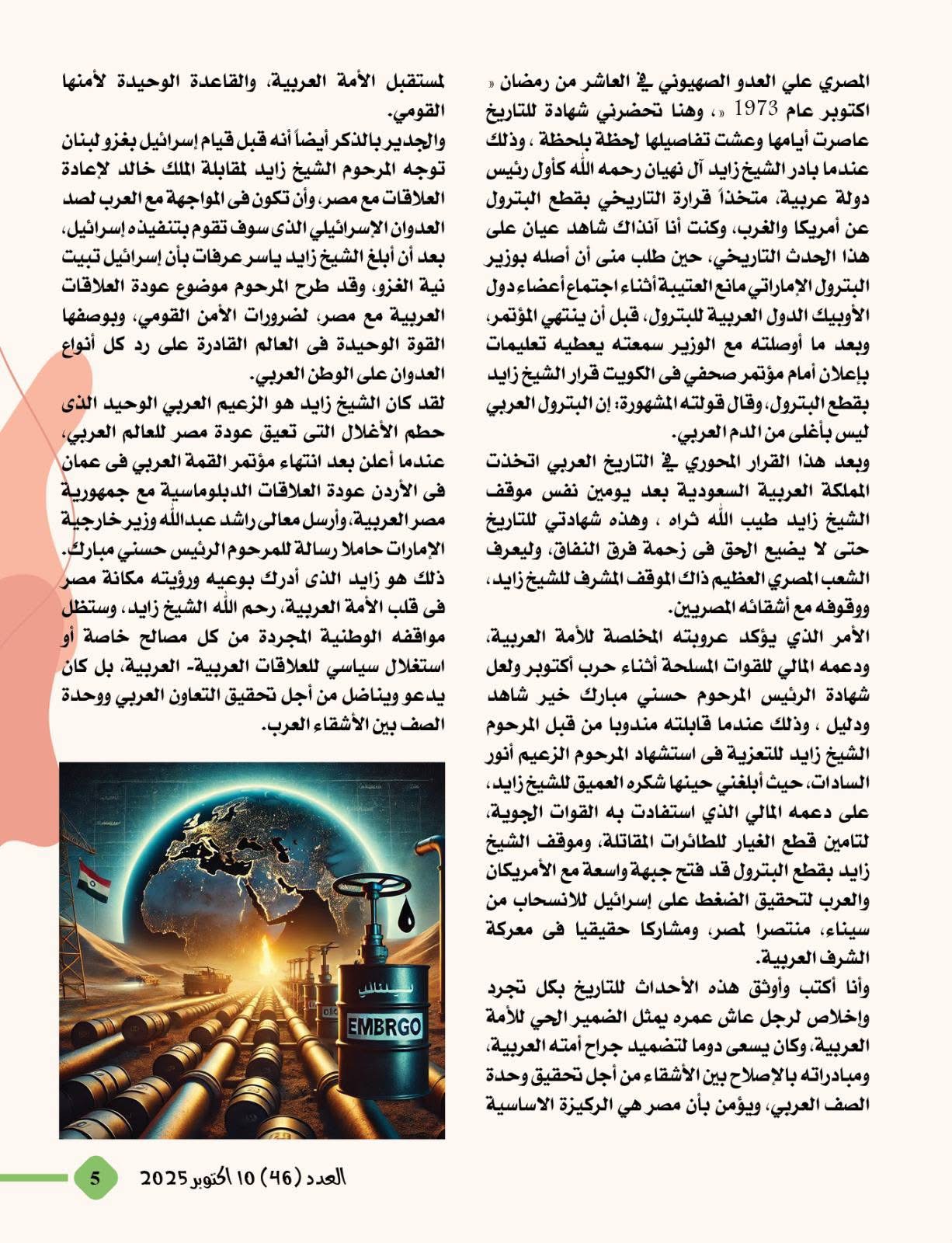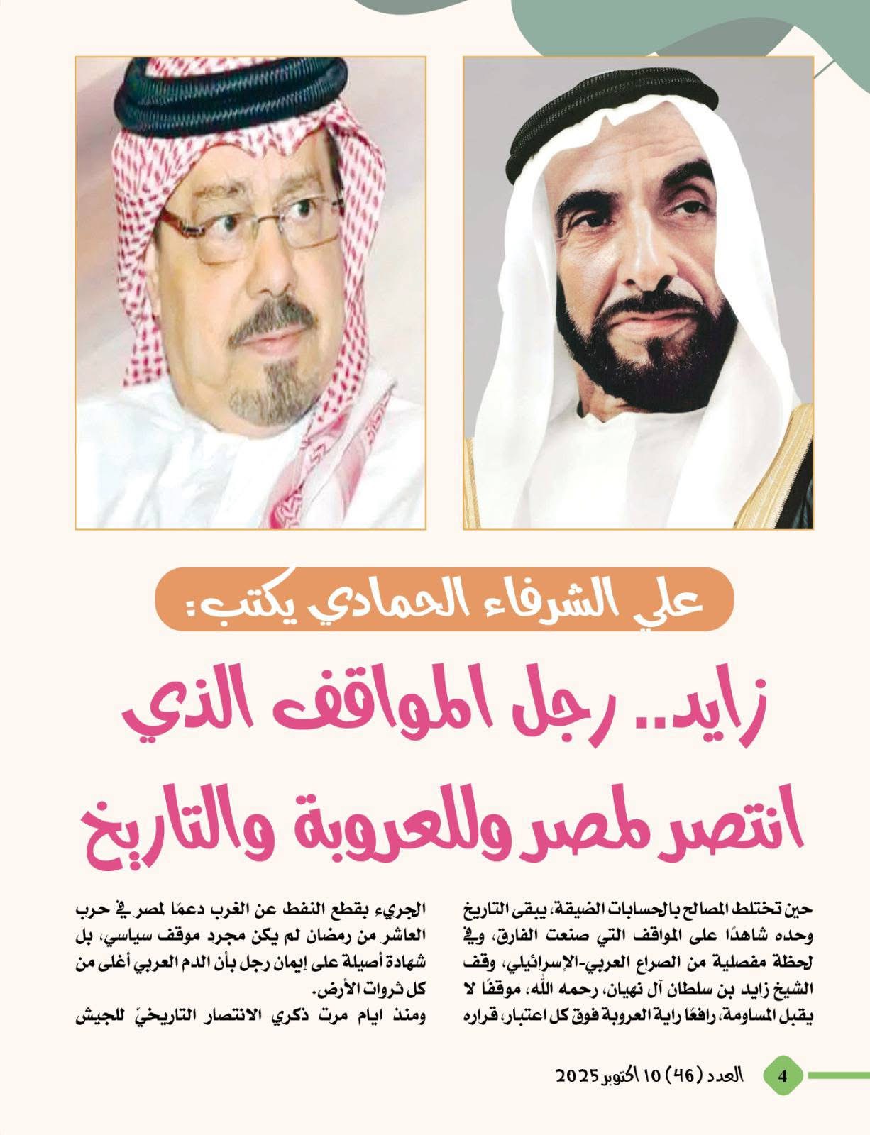 ويتناول المقال سيرة القائد المؤسس الشيخ زايد بن سلطان آل نهيان، باعتباره شخصية استثنائية سطّرت مواقف تاريخية داعمة للوحدة العربية والقضايا المصيرية، وعلى رأسها موقفه المشهود في دعم مصر بعد حرب أكتوبر .