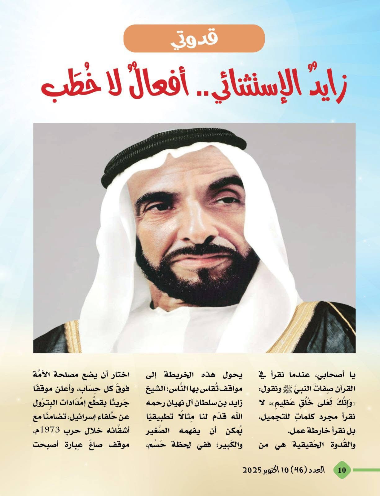 4- فقرة قدوتي : بمقال بعنوان: زايد الاستثنائي.. أفعال لا خطب”، يستعرض محطات من حياة القائد الذي جمع بين القول والعمل.