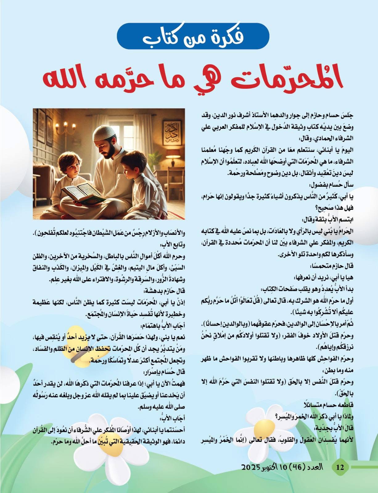 5- فقرة فكرة من كتاب: حوار فكري من كتاب “وثيقة الدخول في الإسلام” للمفكر علي الشرفاء، بعنوان: المحرّمات هي ما حرّمه الله “ في إطار تبسيط المفاهيم الدينية للأطفال.