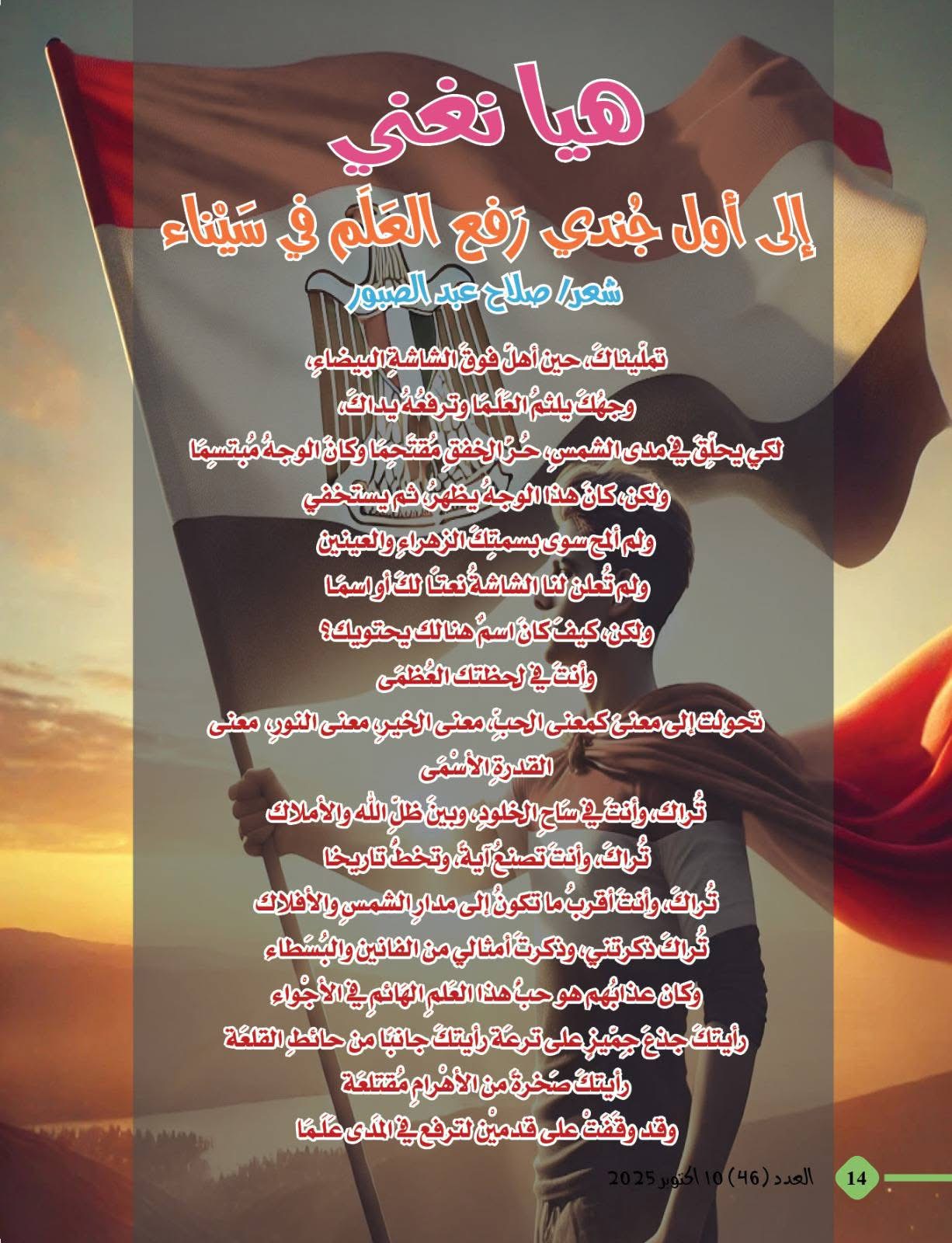 7- فقرة هيا نغني: نشيد وطني بعنوان : “ إلى أول جندي رفع العلم في سيناء” من شعر الراحل صلاح عبد الصبور .