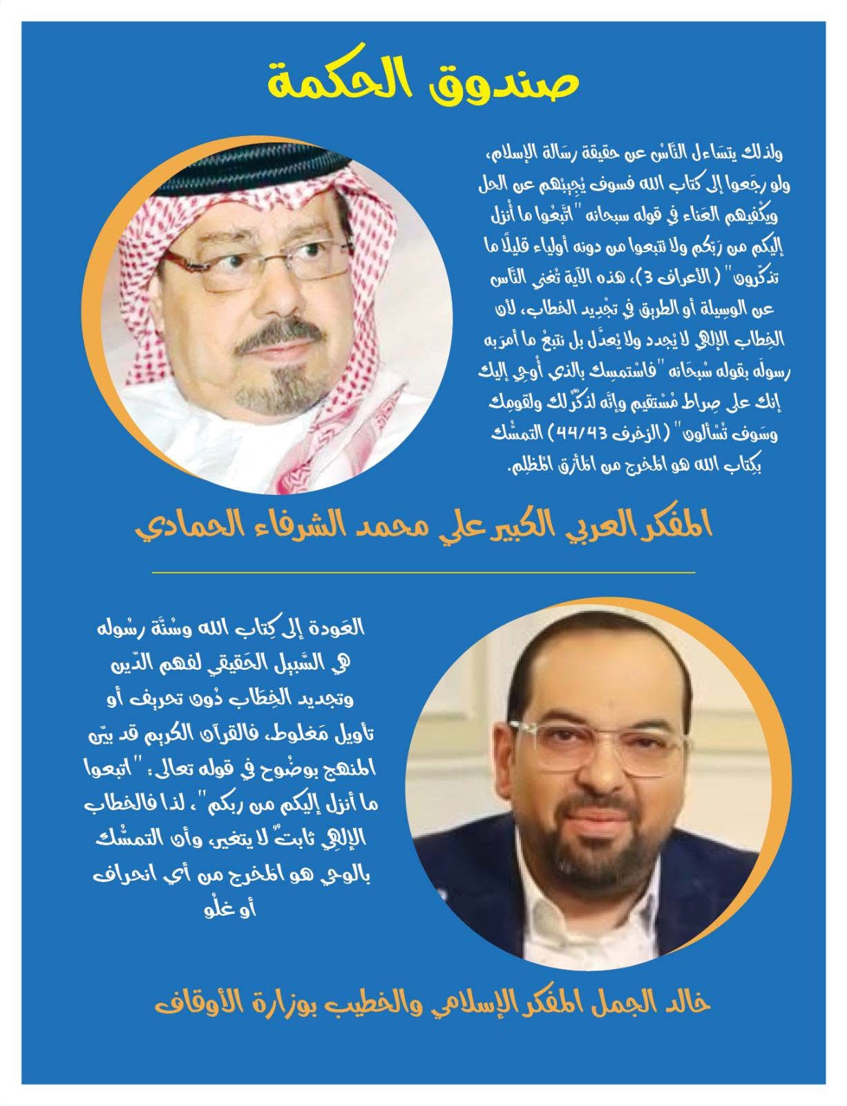9- فقرة صندوق الحكمة: مقولة ملهمة للمفكر علي الشرفاء، وتعليق توضيحي من الباحث خالد الجمل .