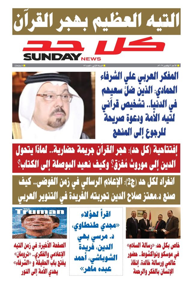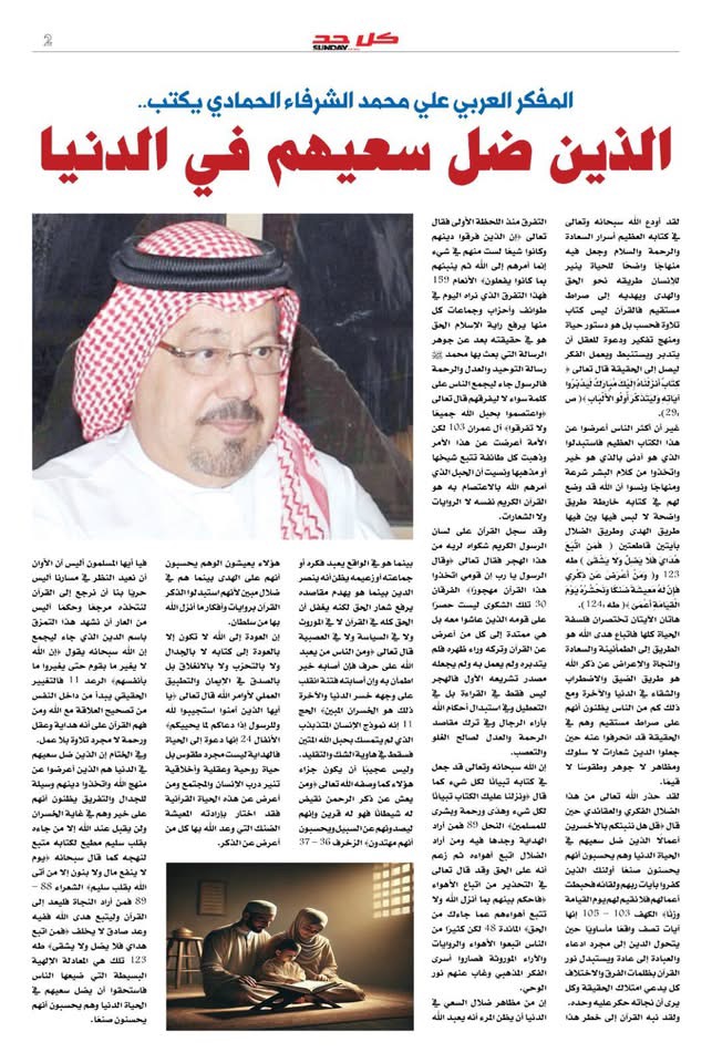 وتصدر العدد مقال للمفكر العربي الكبير علي الشرفاء الحمادي بعنوان : الذين ضل سعيهم في الدنيا " ، تناول فيه مظاهر الانحراف عن منهج القرآن وأثر ذلك على مسار الإنسانية .