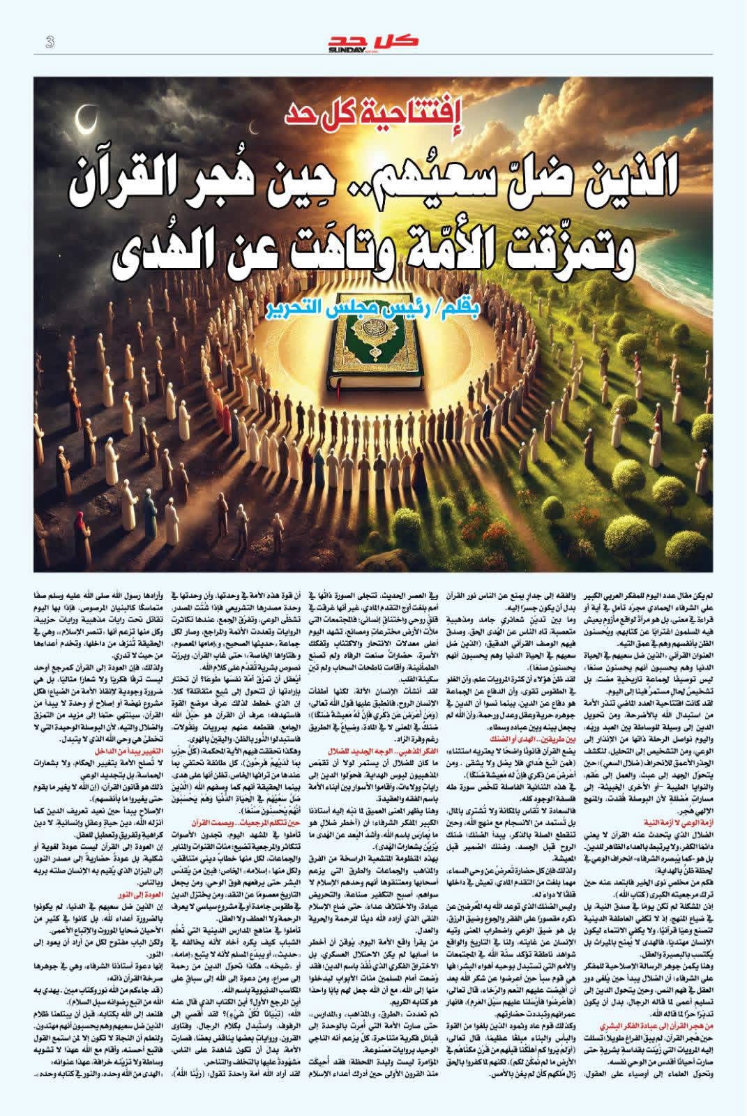 صدر اليوم الأحد 2 نوفمبر 2025 العدد الجديد رقم " 52 "من مجلة " كل حد " الصادرة عن مؤسسة رسالة السلام العالمية، حاملاً بين صفحاته ملف رئيسي بعنوان " التيه العظيم بهجر القرآن " ، يناقش أبعاد الابتعاد عن الهدي القرآني وانعكاساته على الواقع الإنساني والفكري للأمة .
