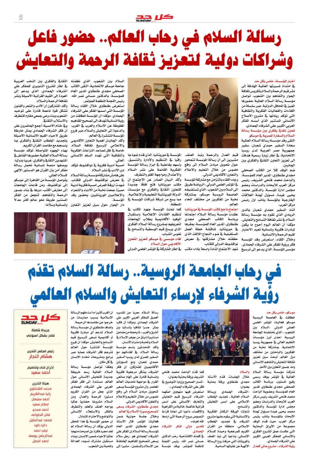 وشهد العدد تغطية خاصة للمشاركة المتميزة لوفد مؤسسة رسالة السلام العالمية في فعاليات المؤتمر العلمي الدولي " السلام بين الشعوب " والذي استضافته الجامعة الروسية، حيث قدّم الوفد عدد من الأوراق البحثية التي أبرزت جهود المؤسسة في تعزيز قيم التعايش والسلام العالمي .