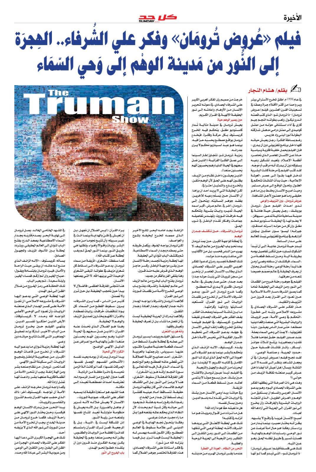 وفي الصفحة الأخيرة، قدّم رئيس مجلس التحرير الكاتب الصحفي هشام النجار مقال نقدي تحليلي بعنوان " فيلم عروض ترومان وفكر علي الشرفاء .. الهجرة إلى النور من مدينة الوهم إلى وحي السماء " ، ربط فيه بين الرسالة الإنسانية للفن ورؤية المفكر علي الشرفاء في الدعوة إلى وعي جديد يعيد للإنسان توازنه الروحي والفكري .