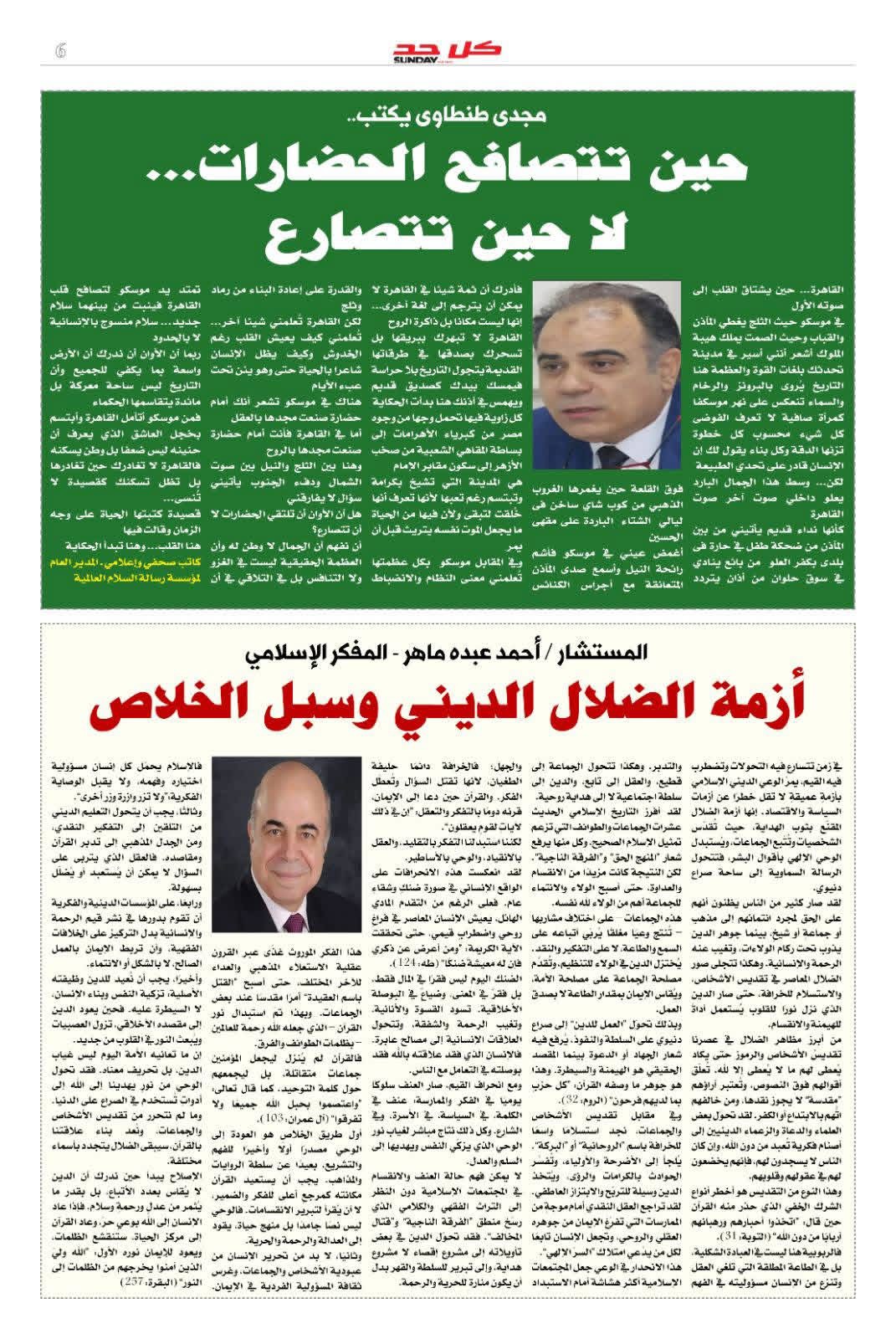 كما نُشر في العدد مقال تحليلي نوعي للكاتب الصحفي مجدي طنطاوي، المدير العام لمؤسسة رسالة السلام، تحت عنوان " حين تتصافح الحضارات .. لا حين تتصارع " دعا فيه إلى ترسيخ قيم الحوار والتفاعل الحضاري بين الأمم بدلاً من منطق الصدام والتناحر .