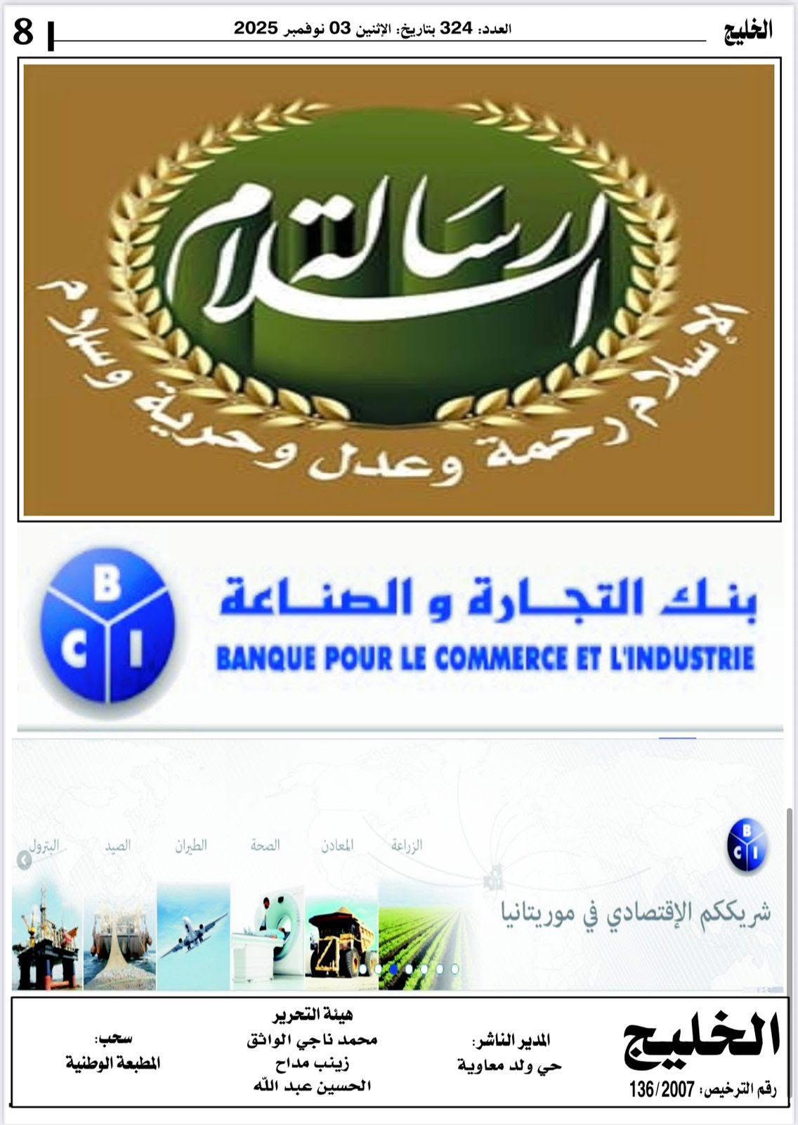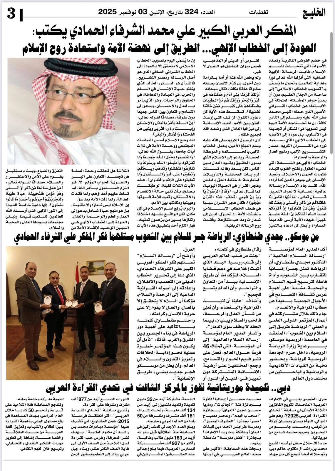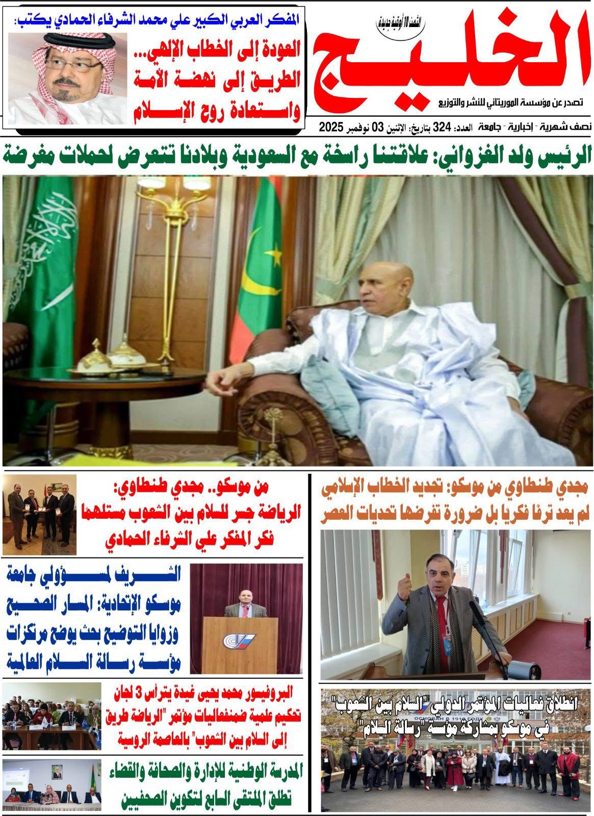 وفي كلمته الافتتاحية، الكاتب المشارك الصحفي حيّ معاوية، مدير مؤسسة رسالة السلام في موريتانيا والمدير الناشر لجريدة الخليج، إلى أن هذا العدد يأتي في إطار لحركة تحريرية تقوم بمبادرة التحرك الفكري والمسؤولية، بالتأكيد أن الجريدة تترك القارئ العربي في أحدث الأحداث السياسية والثقافية التي شهدتها المنطقة .
