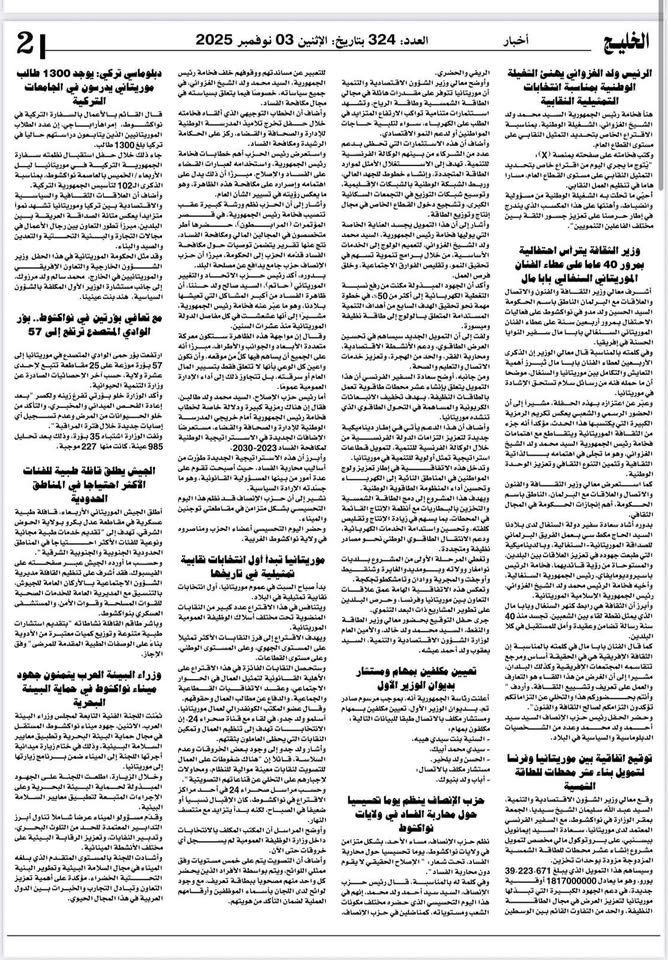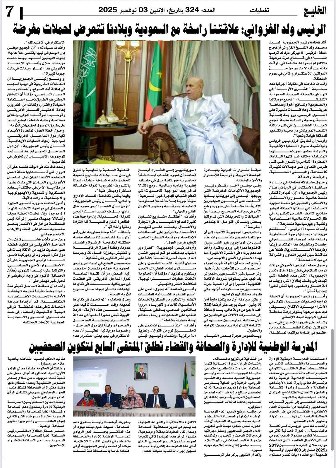 وتضمّن العدد كذلك تصريحات للرئيس الموريتاني محمد ولد الشيخ الغزواني الذي شدد على عمق العلاقات بين موريتانيا والمملكة العربية السعودية، مؤكداً أن علاقة البلدين راسخة ومتجذّرة، وأن موريتانيا تتعرض لحملات مغرضة لن تنال من استقرارها .