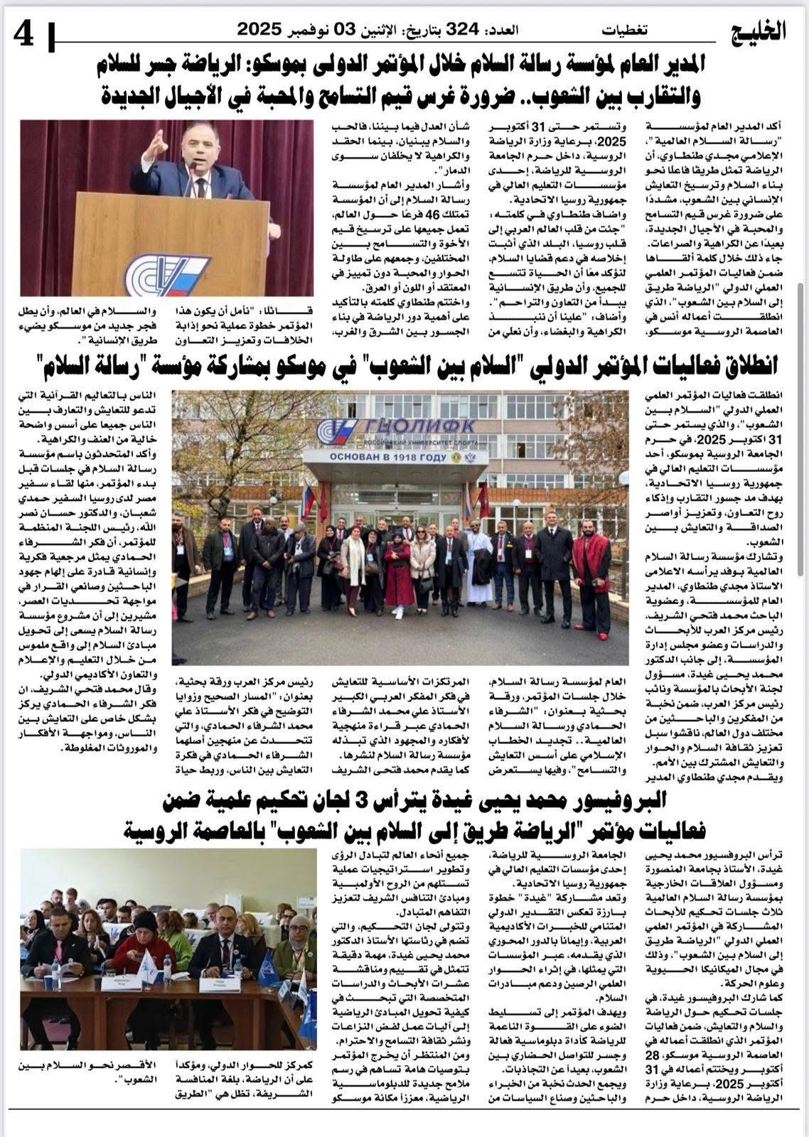 كما كتب الإعلامي مجدي طنطاوي من العاصمة الروسية موسكو تقريراً بعنوان : " الرياضة جسر السلام بين الشعوب " ، استلهم فيه فكر المفكر علي الشرفاء الحمادي حول أهمية بناء جسور التفاهم الإنساني من خلال القيم المشتركة التي توحّد الشعوب وتنبذ العنف .