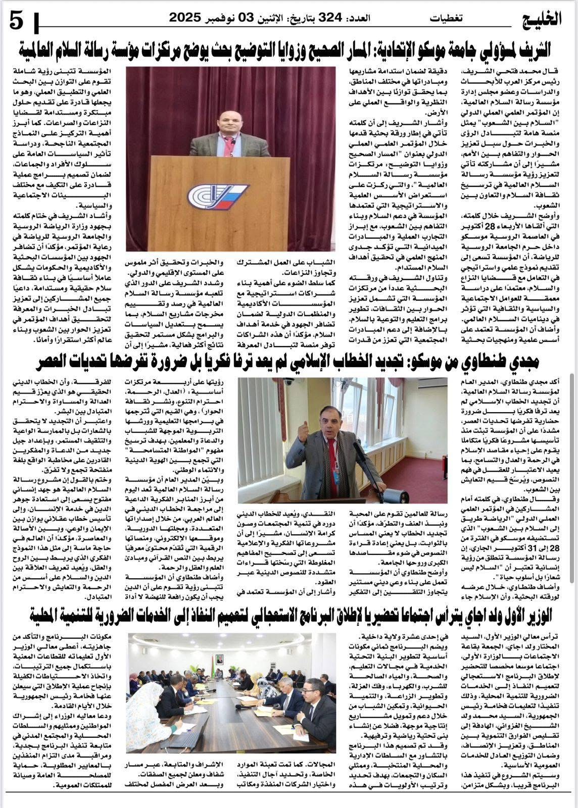 وفي سياق متصل، أجرى الباحث محمد فتحي الشريف لمسؤولي جامعة موسكو الاتحادية لقاءً موسعاً قدّم خلاله بحثاً بعنوان : " المسار الصحيح وزوايا التوضيح " ، و الذي استعرض فيه مرتكزات مؤسسة رسالة السلام العالمية ودورها في نشر ثقافة التسامح والتعايش ونبذ العنف باسم الدين .