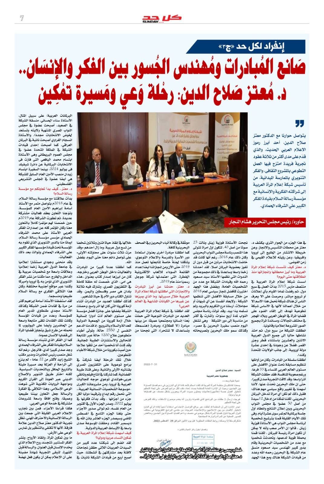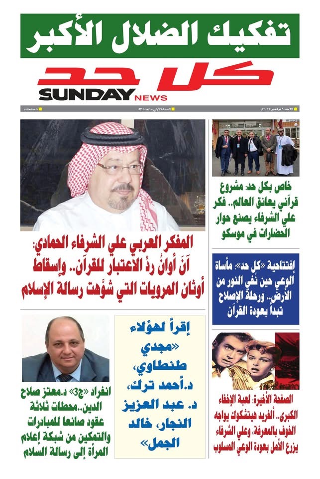 وفي تصريح خاص قال الكاتب الصحفي هشام النجار رئيس مجلس تحرير المجلة ان العدد الأخير من " كل حد " يؤكد علي أن مشروع علي الشرفاء الحمادي ليس مجرد جهد فكري فردي، انما هو بمثابة حركة إصلاح معرفي متكاملة تسعى إلى تحرير الإنسان من التطرف والغلو ، وإحياء القيم القرآنية الأصيلة في الوعي الجمعي للأمة العربية والإسلامية، من خلال مقالاته وأبحاثه ومبادرات مؤسسة " رسالة السلام " .