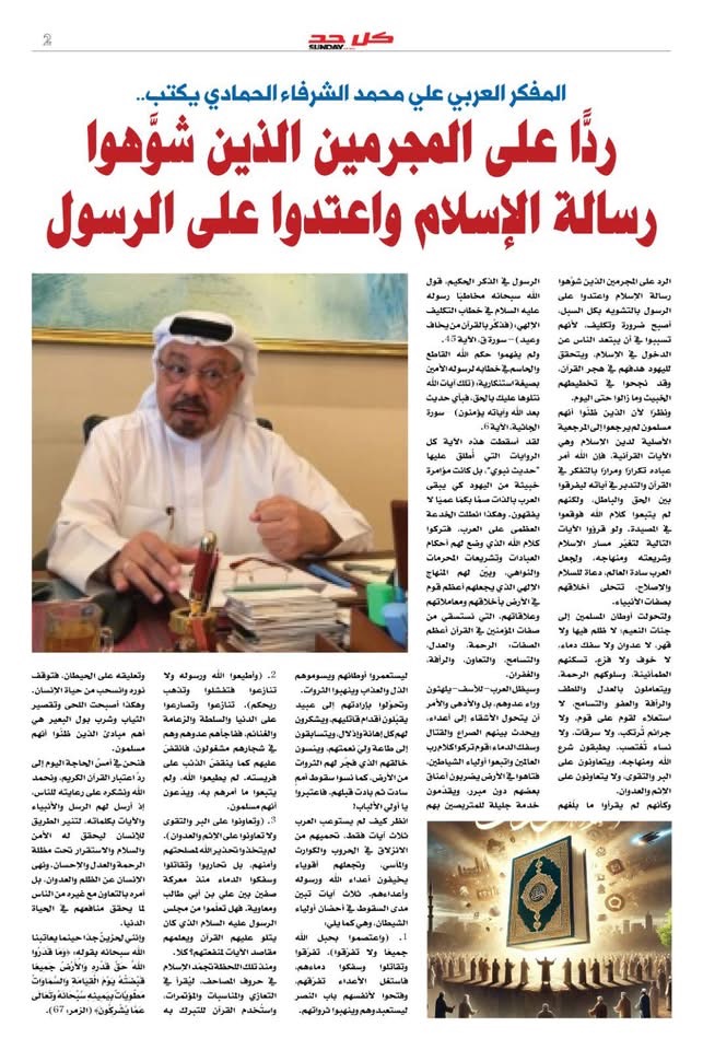 ويتصدر العدد مقال المفكر العربي الكبير علي الشرفاء الحمادي بعنوان : " رداً على المجرمين الذين شوّهوا رسالة الإسلام وافتروا على الرسول " ، وهو نص فكري عميق يأتي امتداداً لمشروعه التنويري المتواصل، الذي يهدف إلى تحرير الخطاب الديني من أسر الروايات المفتراة، واستعادة جوهر الإسلام القائم على الرحمة والعدل والعقل .