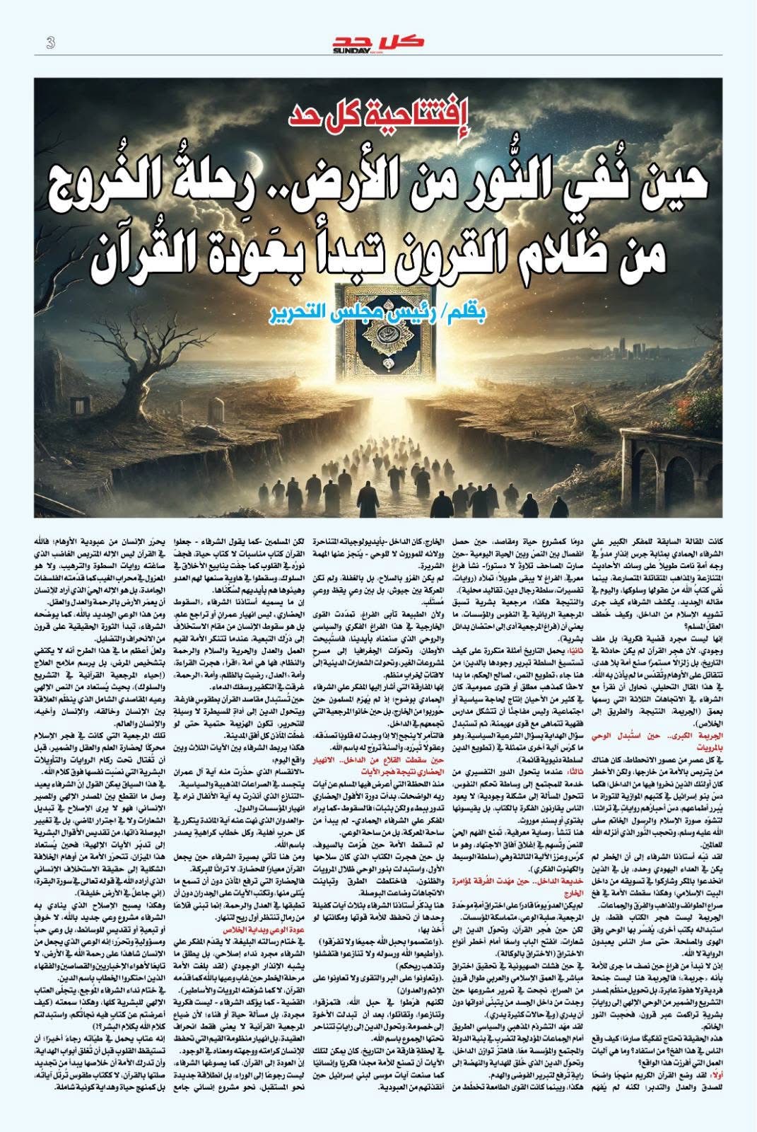 وفي افتتاحية العدد، كتب رئيس مجلس التحرير مقالاً بعنوان : " حين نُفي النور من الأرض .. رحلة الخروج من ظلام القرون تبدأ بعودة القرآن " ، دعا فيه إلى إحياء الوعي القرآني كطريق للخلاص من أزمات الأمة، مؤكداً أن النهضة الفكرية لن تتحقق إلا بقراءة جديدة للقرآن تُعيد إليه مكانته الأولى كمصدر للهداية لا كمادة للجدل الطائفي .
