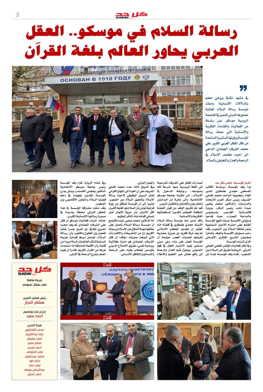 كما تضمن العدد تغطية خاصة لفعاليات وأنشطة وفد مؤسسة " رسالة السلام" في روسيا، ضمن جهود المؤسسة في مد جسور الحوار الثقافي والفكري مع العالم .
