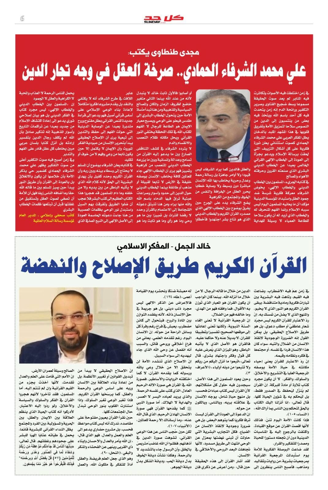 وفي السياق نفسه، يتضمن العدد مقال نوعي بقلم الكاتب الصحفي مجدي طنطاوي، المدير العام لمؤسسة رسالة السلام العالمية، بعنوان : " علي محمد الشرفاء .. صرخة العقل في وجه تجار الدين " ، يرصد فيه الدور الفكري والإنساني الذي يقوم به علي الشرفاء في مواجهة تيارات الغلو والتكفير، وتقديم رؤية عقلانية تعيد التوازن بين الإيمان والعقل، وبين الدين والواقع .