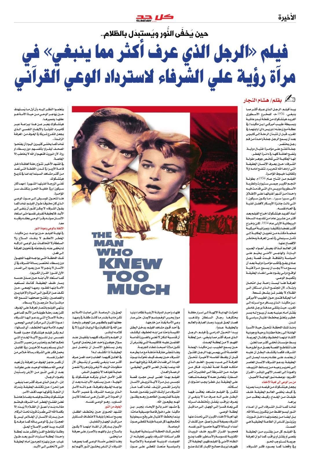 وفي الصفحة الأخيرة، كتب هشام النجار مقال نقدي بعنوان : " حين يُخفى النور ويُستبدل بالظلام .. فيلم الرجل الذي عرف أكثر مما ينبغي .. مرآة رؤية علي الشرفاء لاسترداد الوعي القرآني " ، وقدم فيه قراءة فكرية وفنية تتقاطع مع أطروحات الشرفاء حول مفهوم الوعي والبحث عن الحقيقة في مواجهة التضليل.