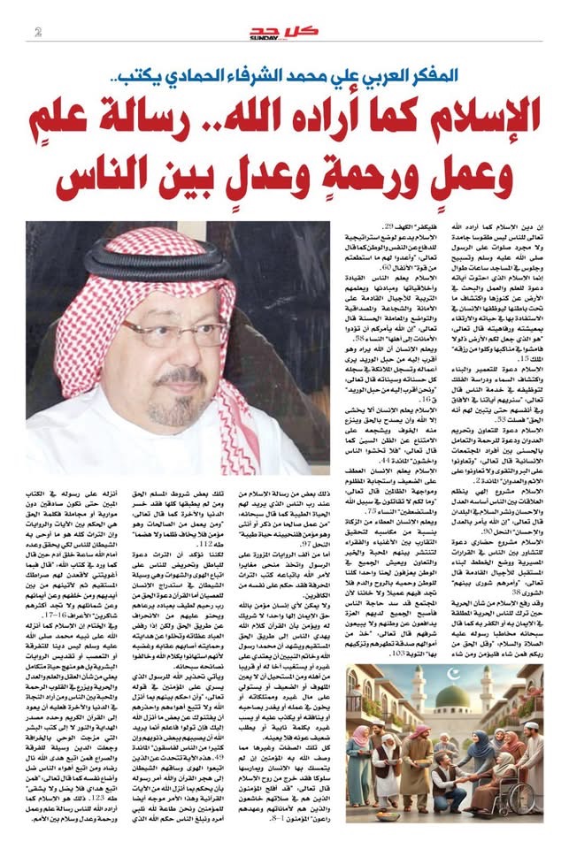 .. و في هذا المقال، يطرح الشرفاء الحمادي رؤيته الإسلامية الحضارية التي تركز على ثلاثة محاور رئيسية :