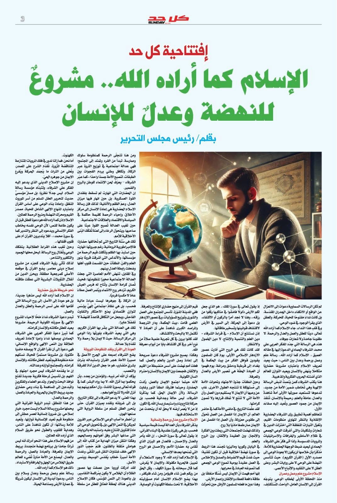 كما كتب رئيس مجلس تحرير المجلة افتتاحية العدد بعنوان : " الإسلام كما أراده الله .. مشروع للنهضة وعدل للإنسان " ، حيث ركز على دور الإسلام في بناء المجتمعات الحديثة وإرساء العدالة الاجتماعية .