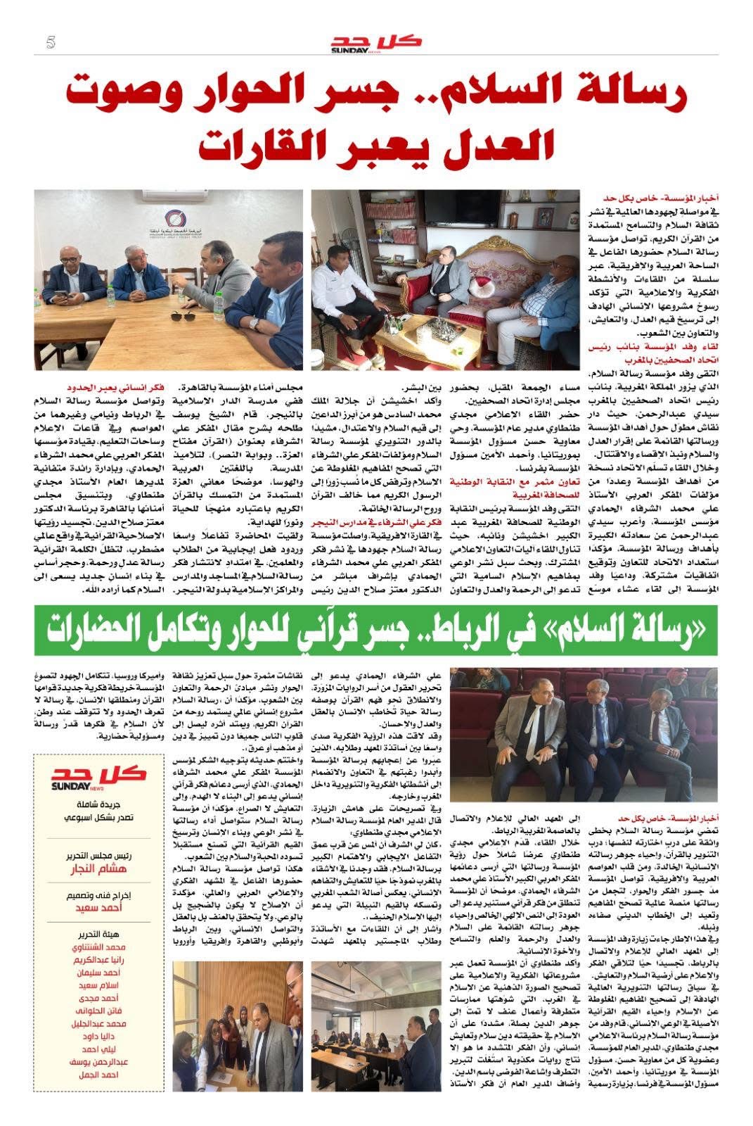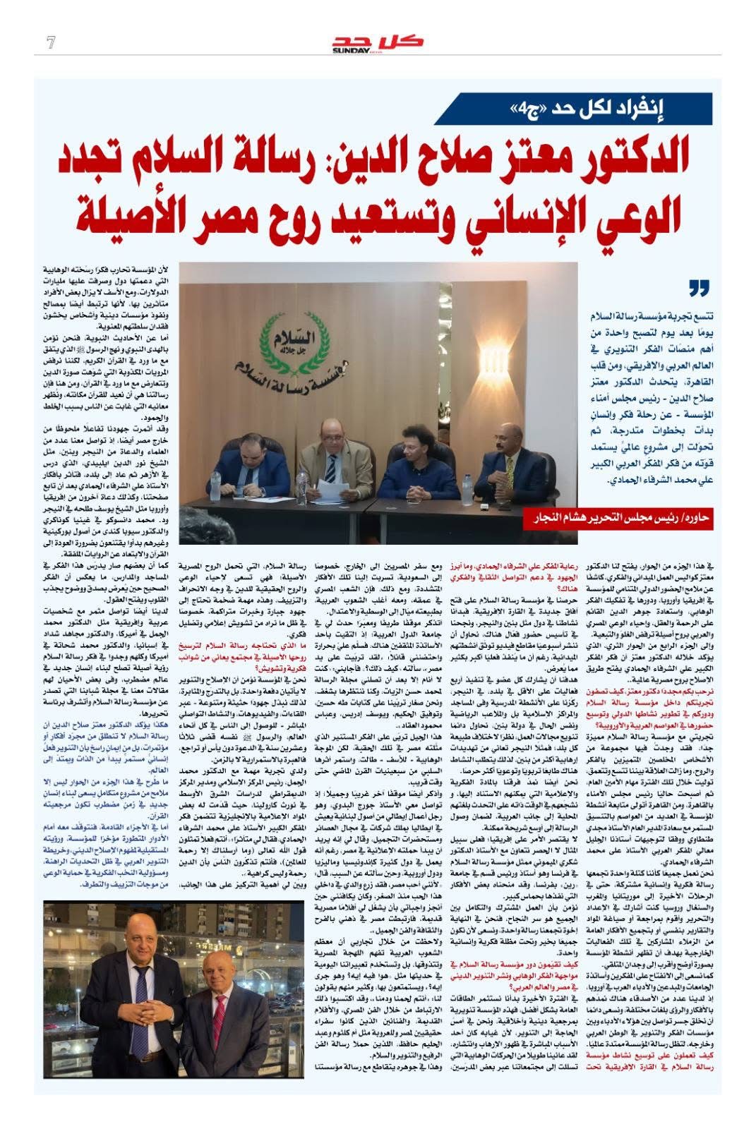 كما تضمن العدد في صفحة الإنفراد الجزء الرابع من الحوار الاستثنائي مع الدكتور معتز صلاح الدين، رئيس مجلس أمناء مؤسسة رسالة السلام بالقاهرة، حيث ناقش أحدث مبادرات المؤسسة في نشر الثقافة التنويرية والفكر الوسطي، وأهمية الدور الإعلامي في تعزيز السلام والتفاهم بين الشعوب .