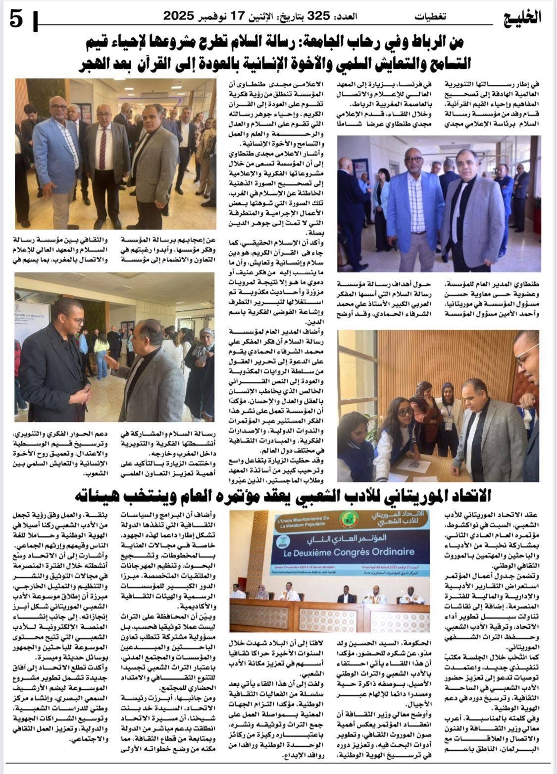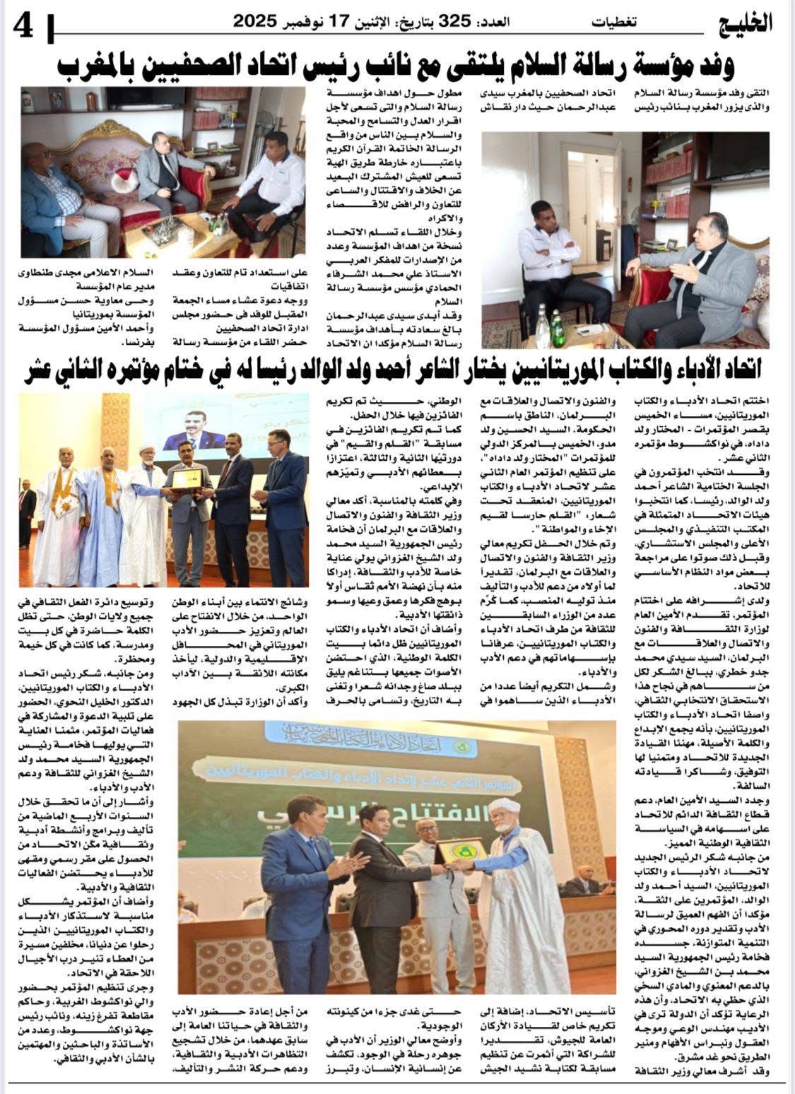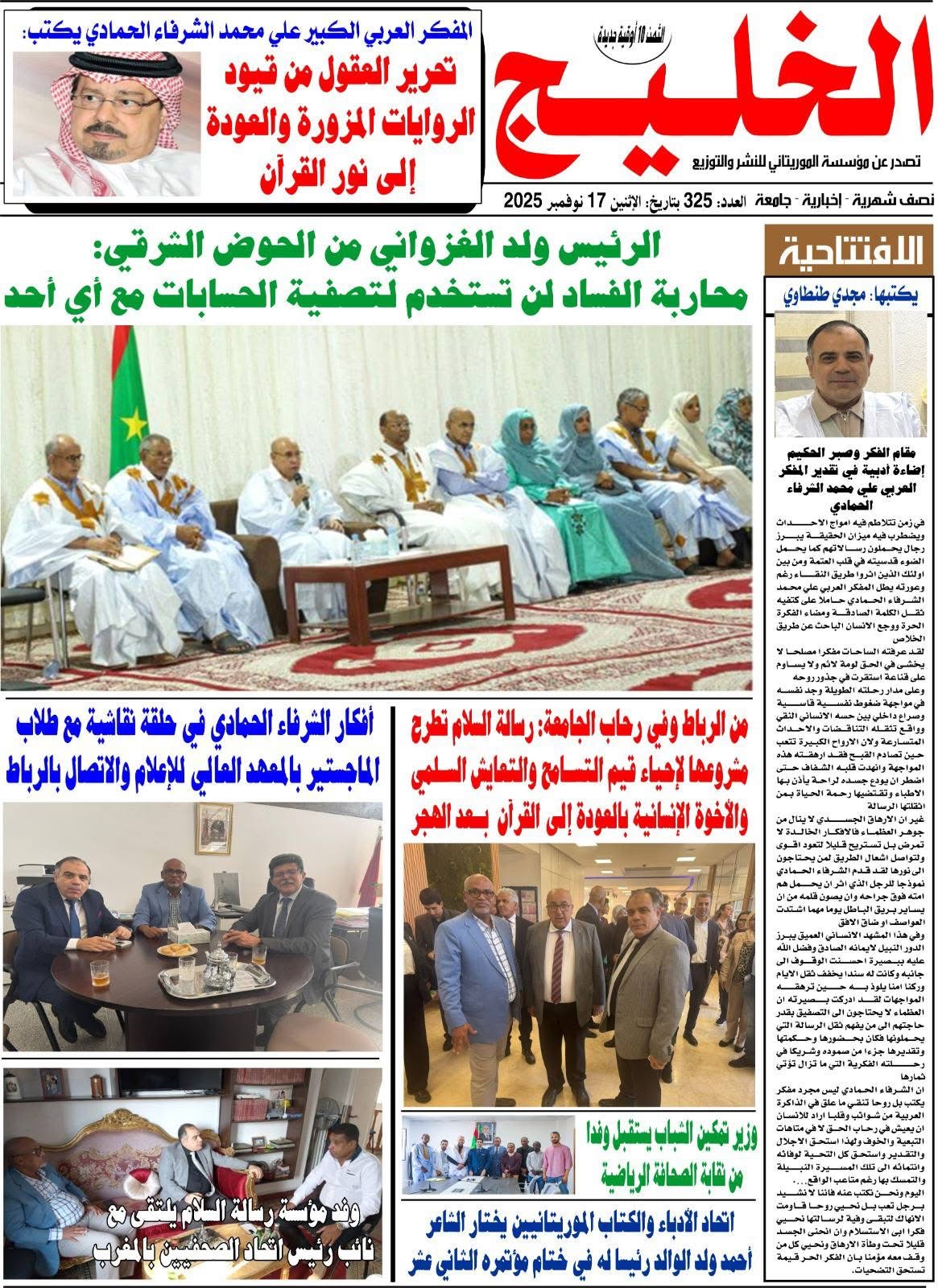أصدرَت جريدة " الخليج " الموريتانية عددها الجديد، والذي جاء غنياً بالملفات الفكرية والتحليلات السياسية، متضمّناً مجموعة من المقالات التي تفتح نقاش واسع حول قضايا إصلاح الخطاب الديني، ومحاربة الفساد، وتعزيز قيم التعايش والسلام .