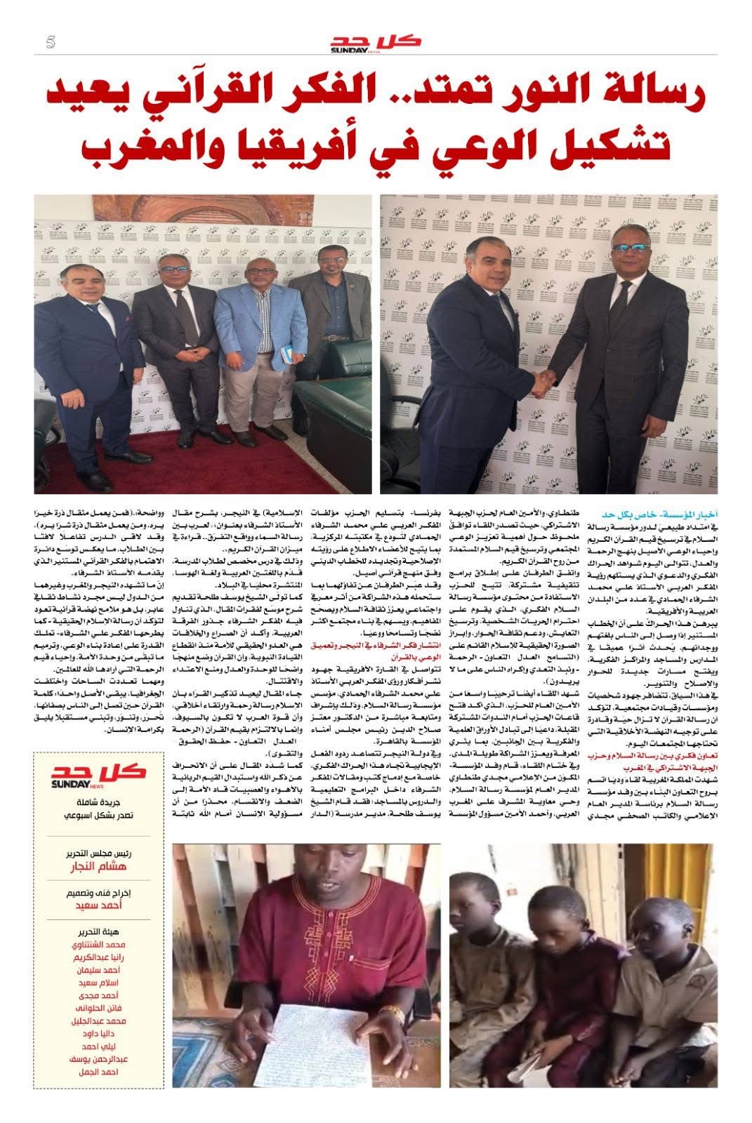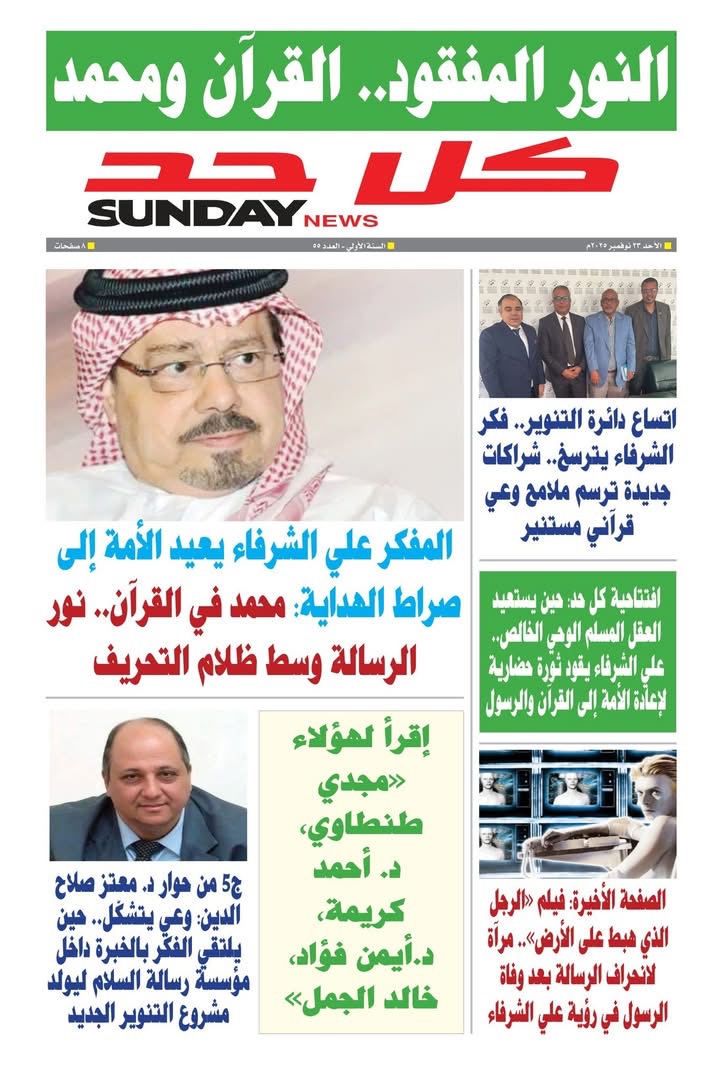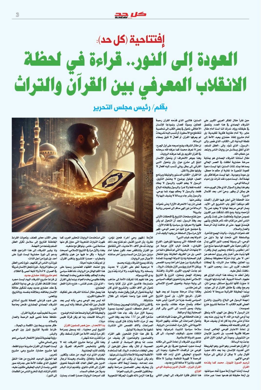 صدر امس الأحد 23 نوفمبر 2025 العدد رقم (55) من مجلة " كل حد " الصادرة عن مؤسسة " رسالة السلام " العالمية، حاملاً ملف رئيسيّ بالغ الأهمية تحت عنوان " النور المفقود .. القرآن ومحمد " ، وهو ملف يعيد طرح العلاقة بين الوحي الإلهي والسرديات التراثية بما يعكس اتجاه المؤسسة نحو إحياء خطاب عقلاني يستند إلى النص القرآني ومقاصده العليا .