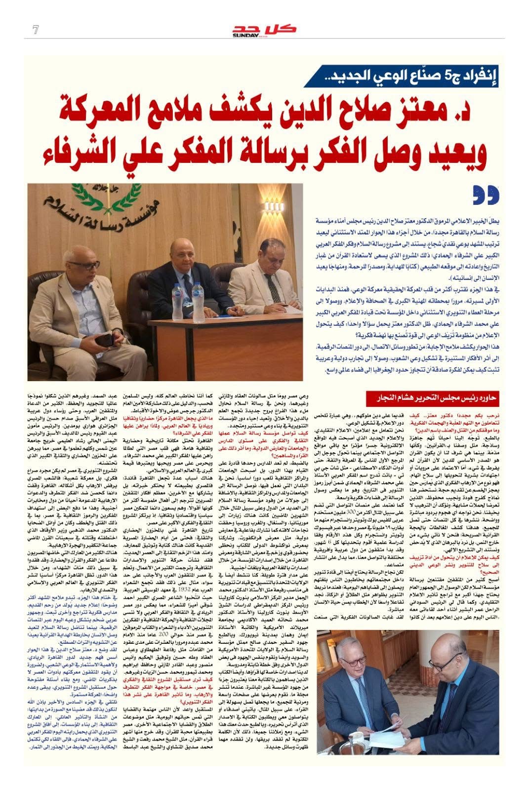 كما واصل العدد نشر الجزء الخامس من الحوار مع رئيس مجلس أمناء المؤسسة الدكتور معتز صلاح الدين، الذي يناقش في حديثه التطوير الإعلامي ومشروع المؤسسة في أفريقيا والتحديات الفكرية في مواجهة التطرف .