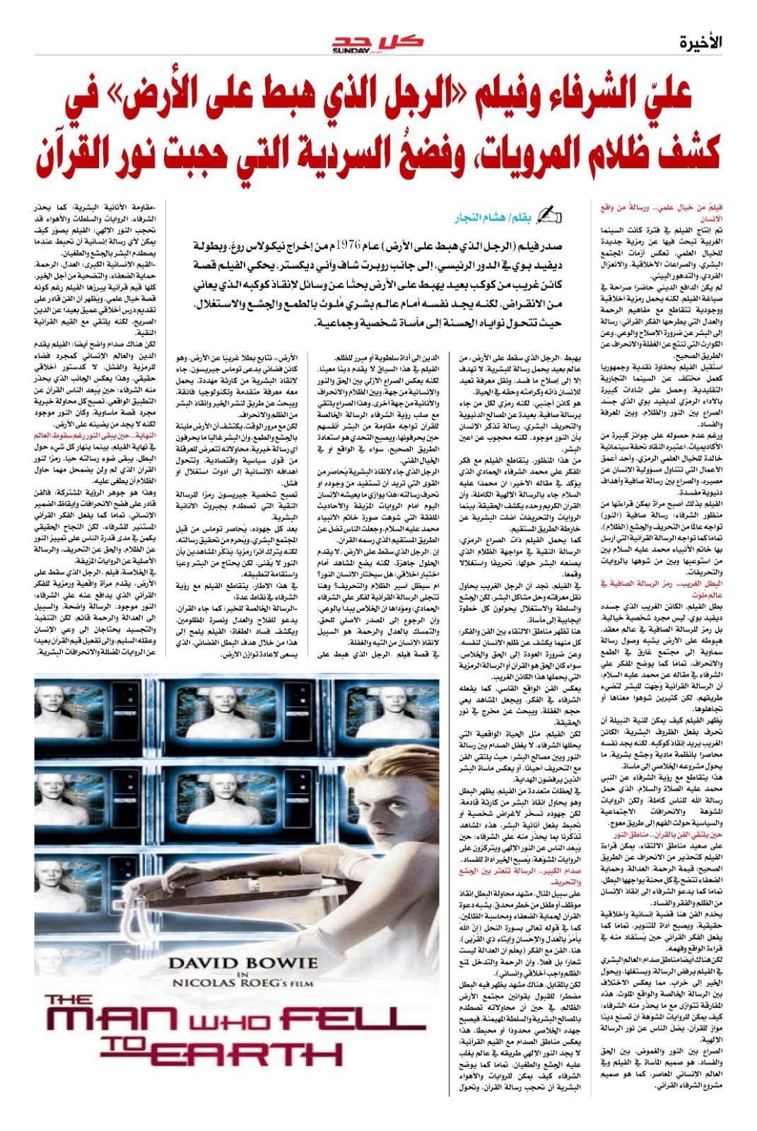 أما في الصفحة الأخيرة فكانت عبارة عن قراءة فنية في ظلام المرويات ، حيث اختتم العدد بمقال نقدي لرئيس مجلس تحرير المجلة الكاتب الصحفي هشام النجار بعنوان : " علي الشرفاء وفيلم .. الرجل الذي هبط على الأرض " ، في كشف ظلام المرويات، وفضح السردية التي حجبت القرآن " ، وفيه يرسم النجار مقاربة فنية بين خطاب الشرفاء في نقد الروايات وبين الفيلم الذي يكشف العوالم المخفية خلف الصورة السطحية للواقع، مشيرًا إلى أن مشروع الشرفاء يمثل محاولة عصرية لكسر هيمنة المرويات على المجال الديني .