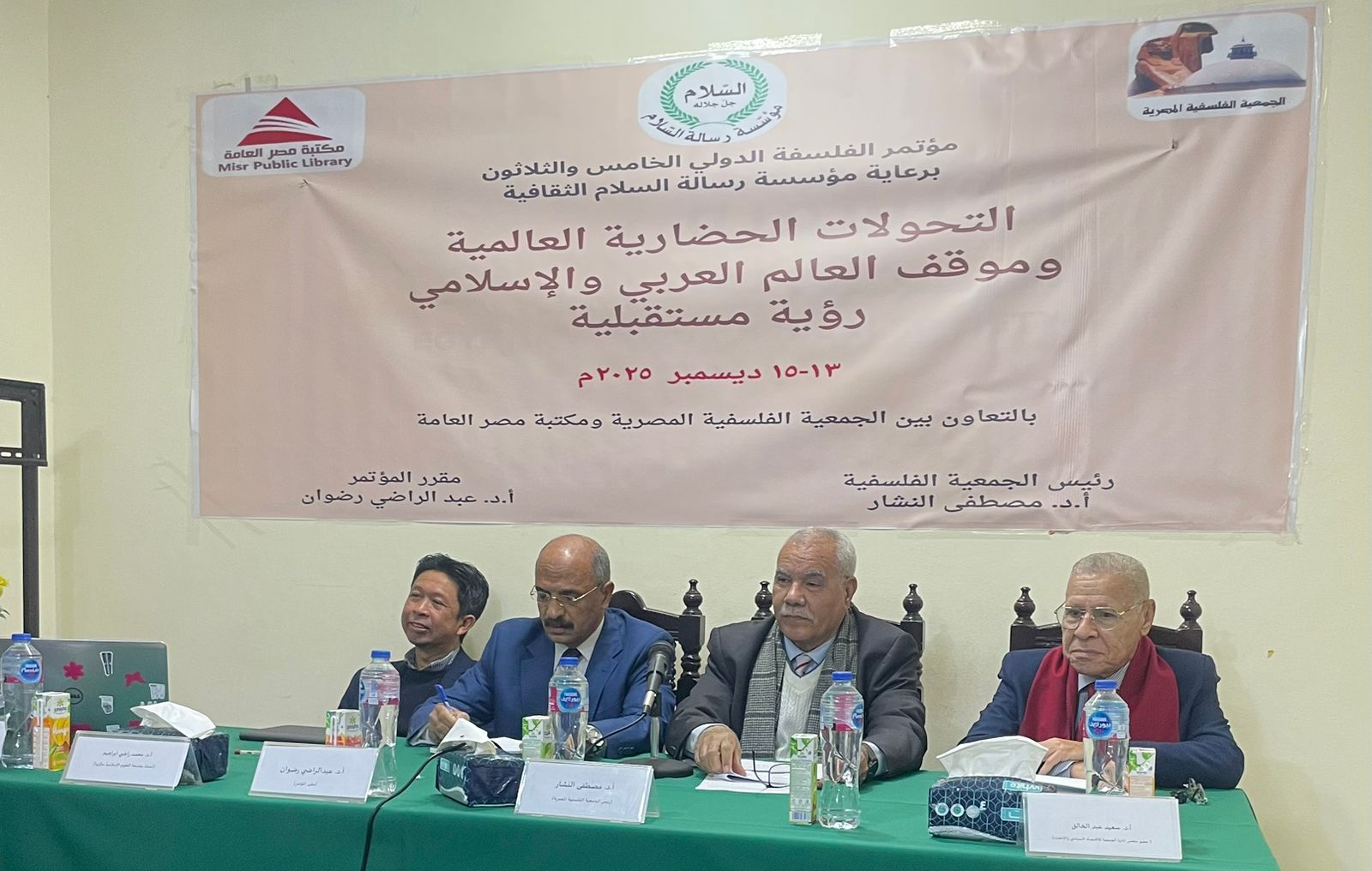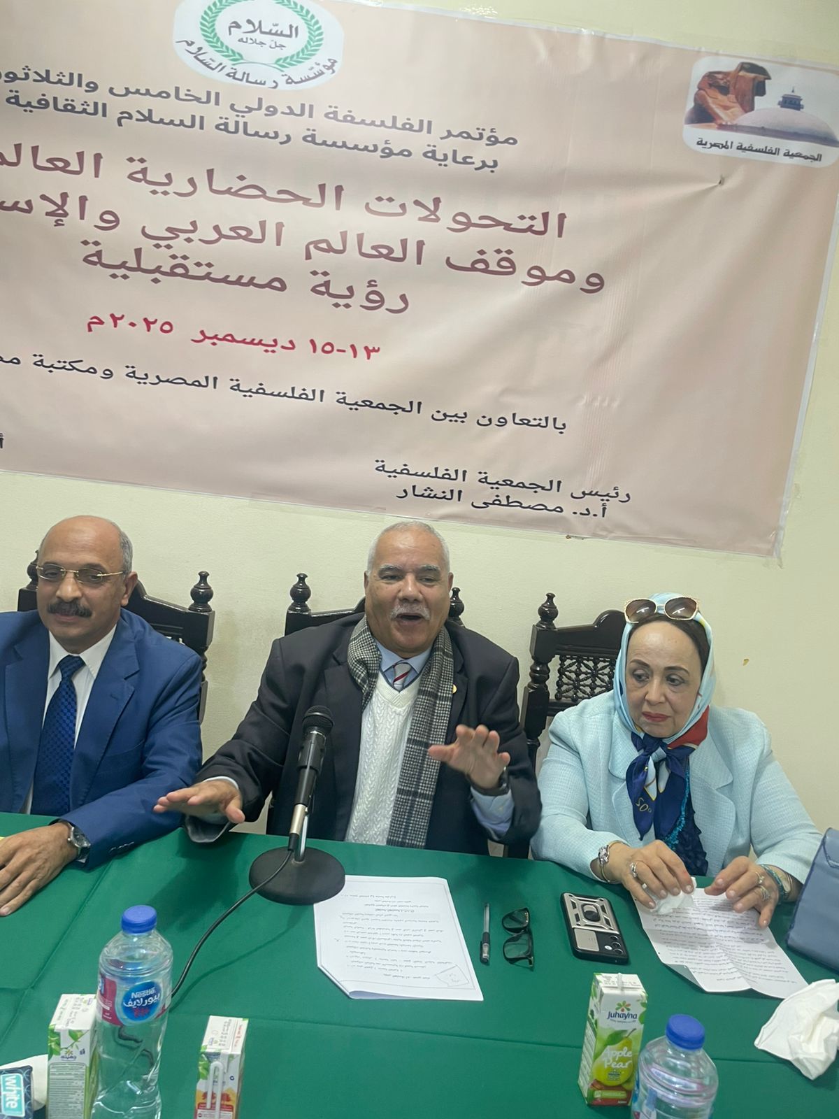 جاء ذلك خلال فعاليات المؤتمر الدولي الخامس والثلاثين للفلسفة والذي انعقد برعاية مؤسسة " رسالة السلام " تحت عنوان : " التحولات الحضارية العالمية وموقف العالم العربي والإسلامي .. رؤية مستقبلية " .