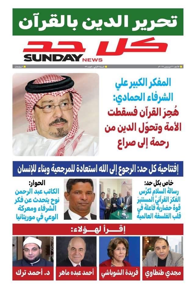 صدر اليوم الأحد 21 ديسمبر 2025 العدد 59 من مجلة " كل حد " الصادرة عن مؤسسة رسالة السلام العالمية متضمناً ملف فكري رئيسي بعنوان " تحرير الدين بالقرآن " في إطار المشروع التنويري الذي تتبناه المؤسسة والمفكر العربي الكبير علي الشرفاء الحمادي الداعي إلى إعادة قراءة الدين من منطلق قرآني تحريري يعزز الوعي الإنساني ويواجه خطاب التطرف .