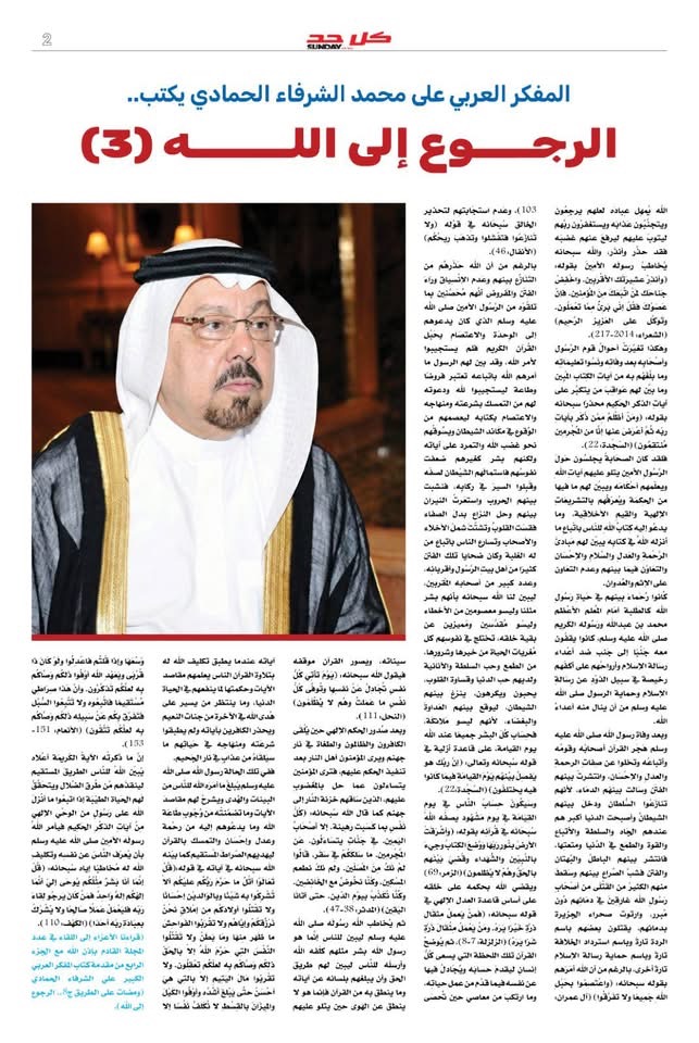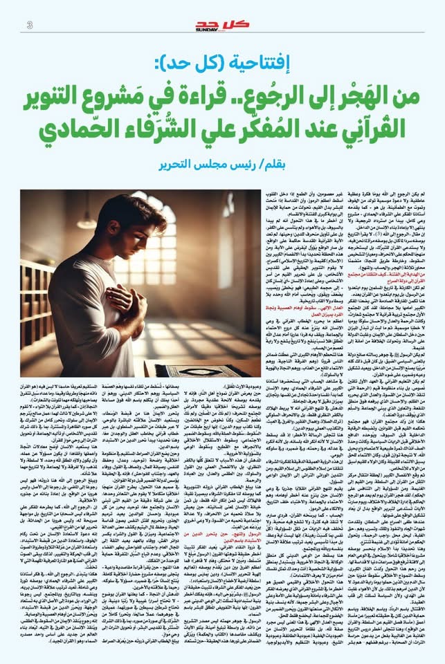 وتصدر العدد مقال فكري للمفكر العربي الكبير علي الشرفاء الحمادي بعنوان " الرجوع إلى الله (3) " ضمن سلسلته الفكرية التي تشكل أحد أعمدة مشروعه المعرفي الهادف إلى تصحيح المفاهيم الدينية وإعادة الاعتبار لقيم العدل والرحمة والعقل .