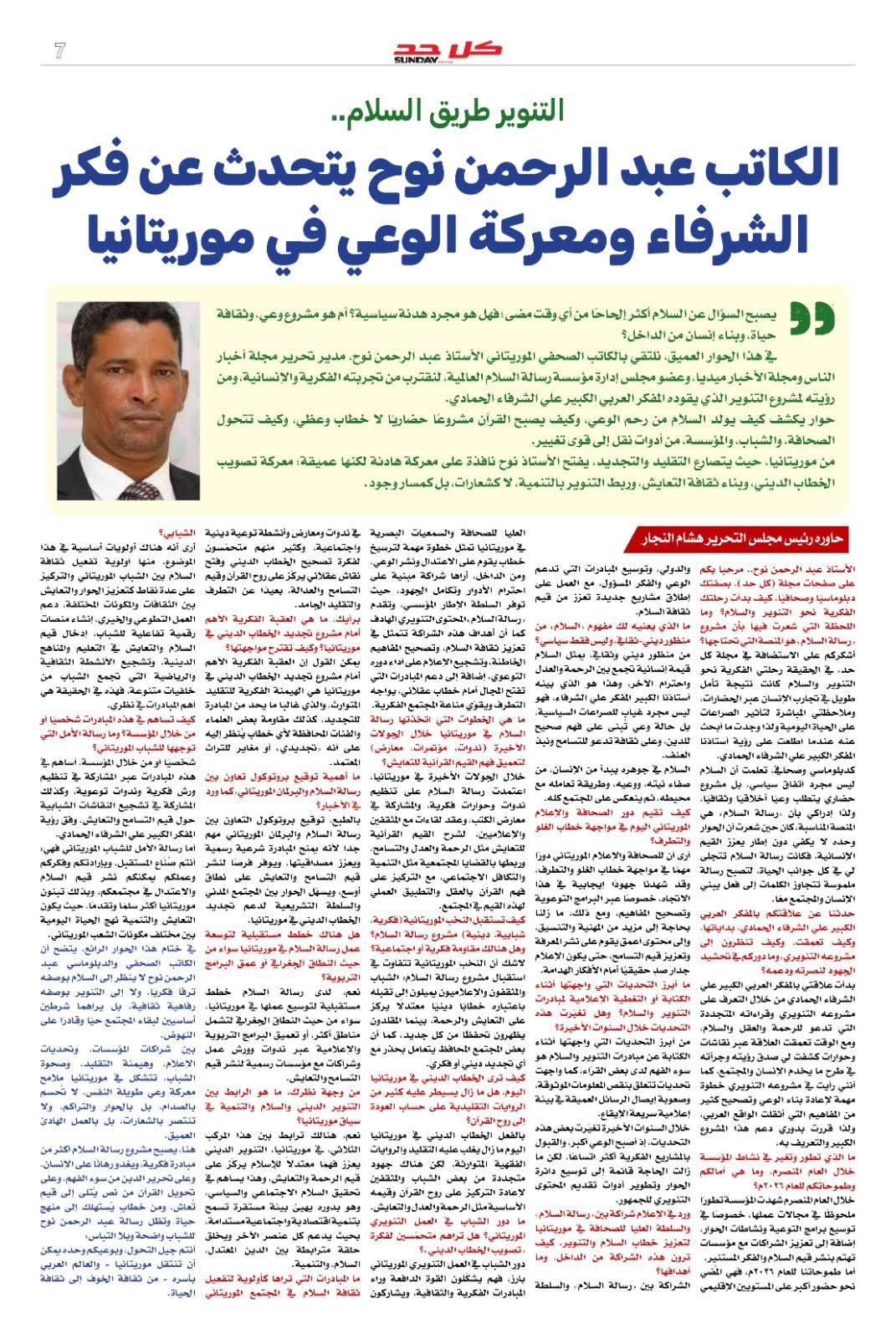 وانفرد العدد بحوار فكري موسع مع الكاتب الموريتاني الأستاذ عبد الرحمن نوح تناول فيه فكر ورؤى المفكر علي الشرفاء الحمادي، ودور مشروعه في معركة الوعي داخل المجتمع الموريتاني والتحديات التي تواجه الخطاب التنويري في العالم العربي .