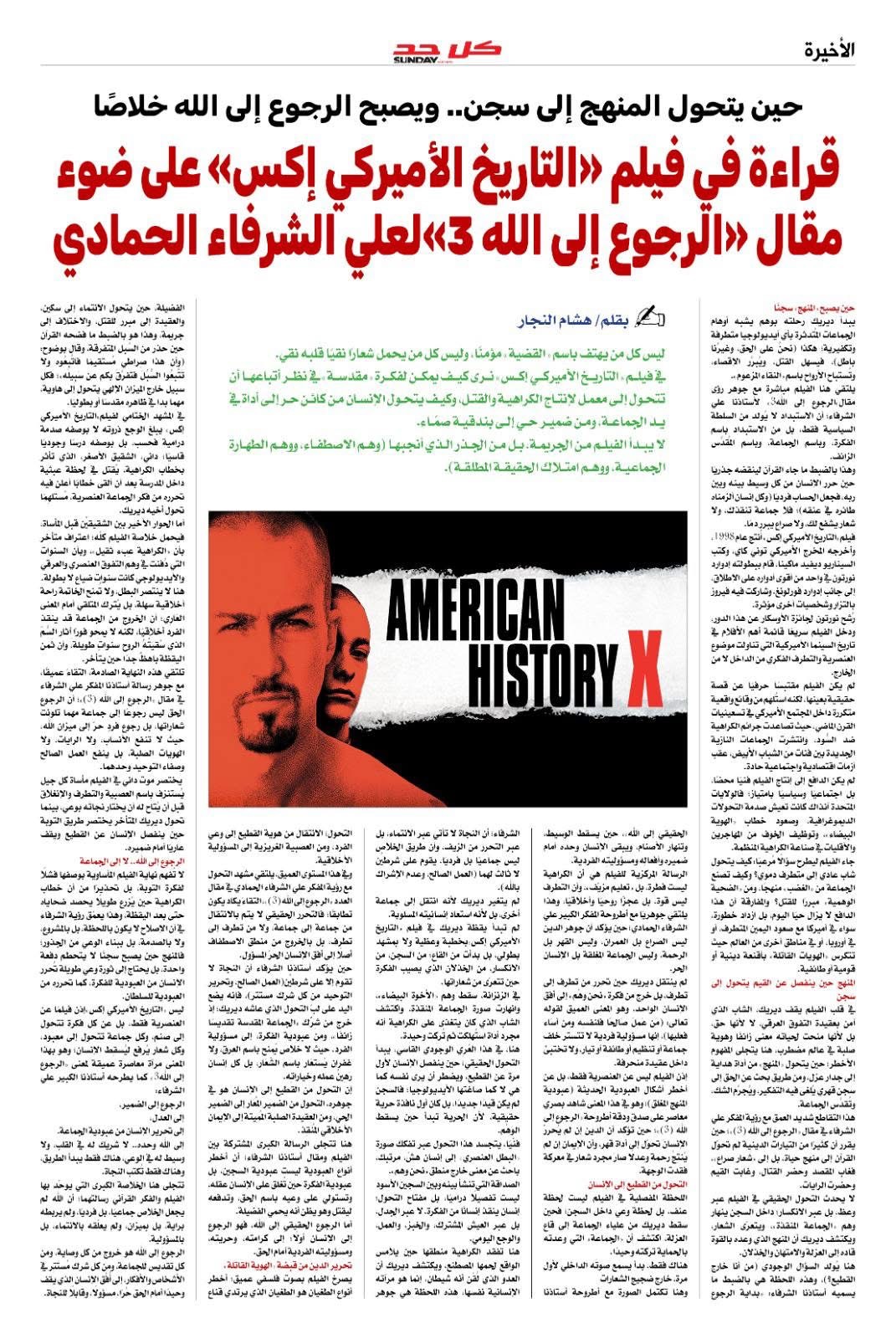 وفي الصفحة الأخيرة التي تشتبك مع المشهد الفني والثقافي قدم رئيس مجلس تحرير المجلة الكاتب الصحفي هشام النجار مقال تحليلي بعنوان : " حين يتحول المنهج إلى سجن ويصبح الرجوع إلى الله خلاصا ً " قراءة نقدية لفيلم " التاريخ الأميركيإكس " على ضوء مقال " الرجوع إلى الله (3) " للمفكر علي الشرفاء الحمادي رابطاً بين الفن والفكر في سياق نقد التطرف الأيديولوجي .