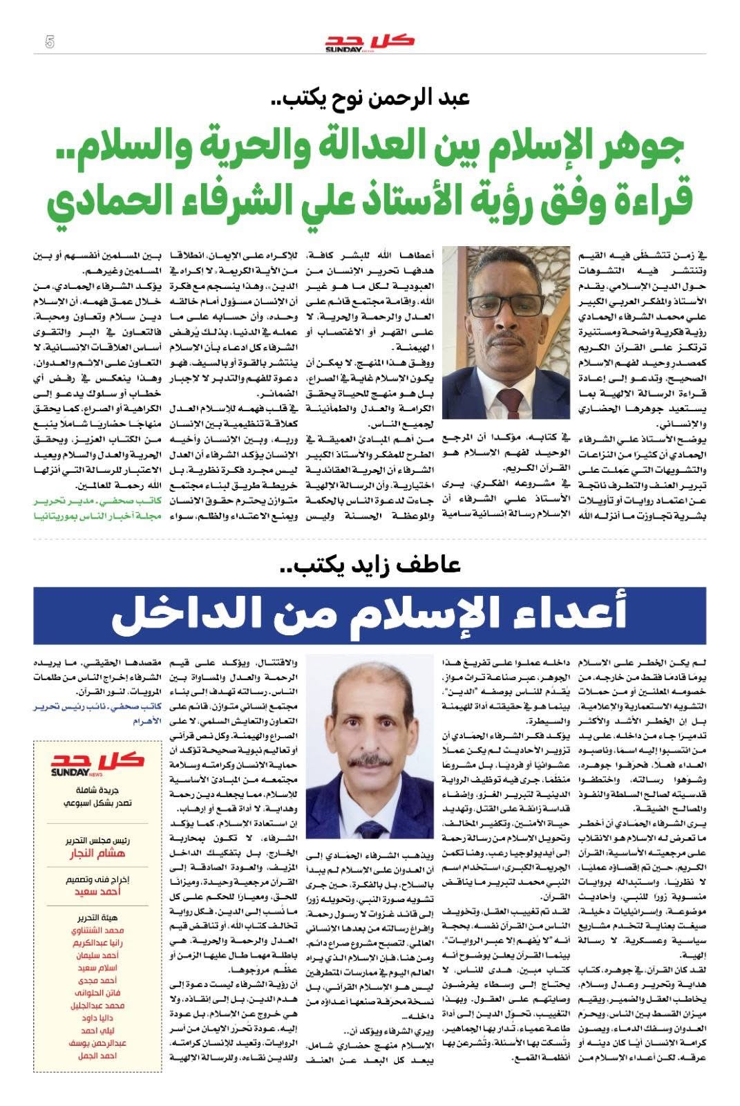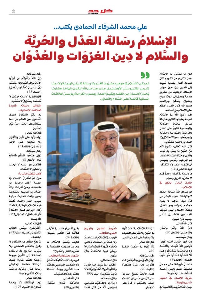وتصدّر العدد مقال مهم للأستاذ علي الشرفاء الحمادي بعنوان : " الإسلام رسالة العدل والحرية والسلام لا دين الغزوات والعدوان " ، والذي يقدّم فيه طرح فكري واضح يهدف إلى تفكيك الخلط المتراكم بين جوهر الإسلام وتاريخ الصراعات السياسية التي البست بالزور ثوب الدين .