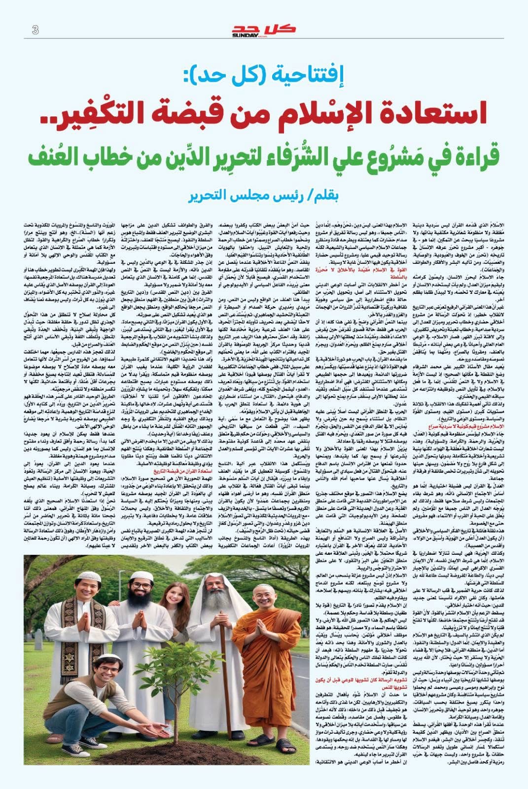 كما جاءت افتتاحية العدد بقلم رئيس مجلس تحرير المجلة بعنوان : " استعادة الإسلام من قبضة التكفير .. قراءة في مشروع علي الشرفاء لتحرير الدين من خطاب العنف " حيث سلطت الضوء على المشروع الفكري لعلي الشرفاء الحمادي باعتباره أحد أبرز المشاريع العربية المعاصرة التي تعمل على الفصل بين الدين والتطرف، وعلى إعادة تقديم الإسلام كرسالة سلام وعدل وتعايش .