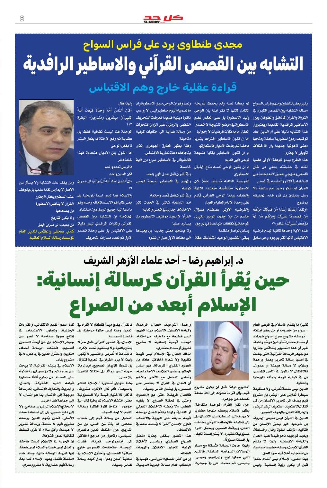 وفي السياق ذاته، تضمّن العدد مقال فكري بارز للكاتب الصحفي مجدي طنطاوي، المدير العام لمؤسسة رسالة السلام، بعنوان : " رداً على فراس السواح .. التشابه بين القصص القرآني والأساطير الرافدية.. قراءة عقلية خارج وهم الاقتباس " ، وقدم فيه معالجة نقدية رصينة تفكك أطروحات التشابه والاقتباس، مؤكدًا علي خصوصية الخطاب القرآني ومنهجه القيمي والإنساني، بعيدًا عن المقارنات الاختزالية .