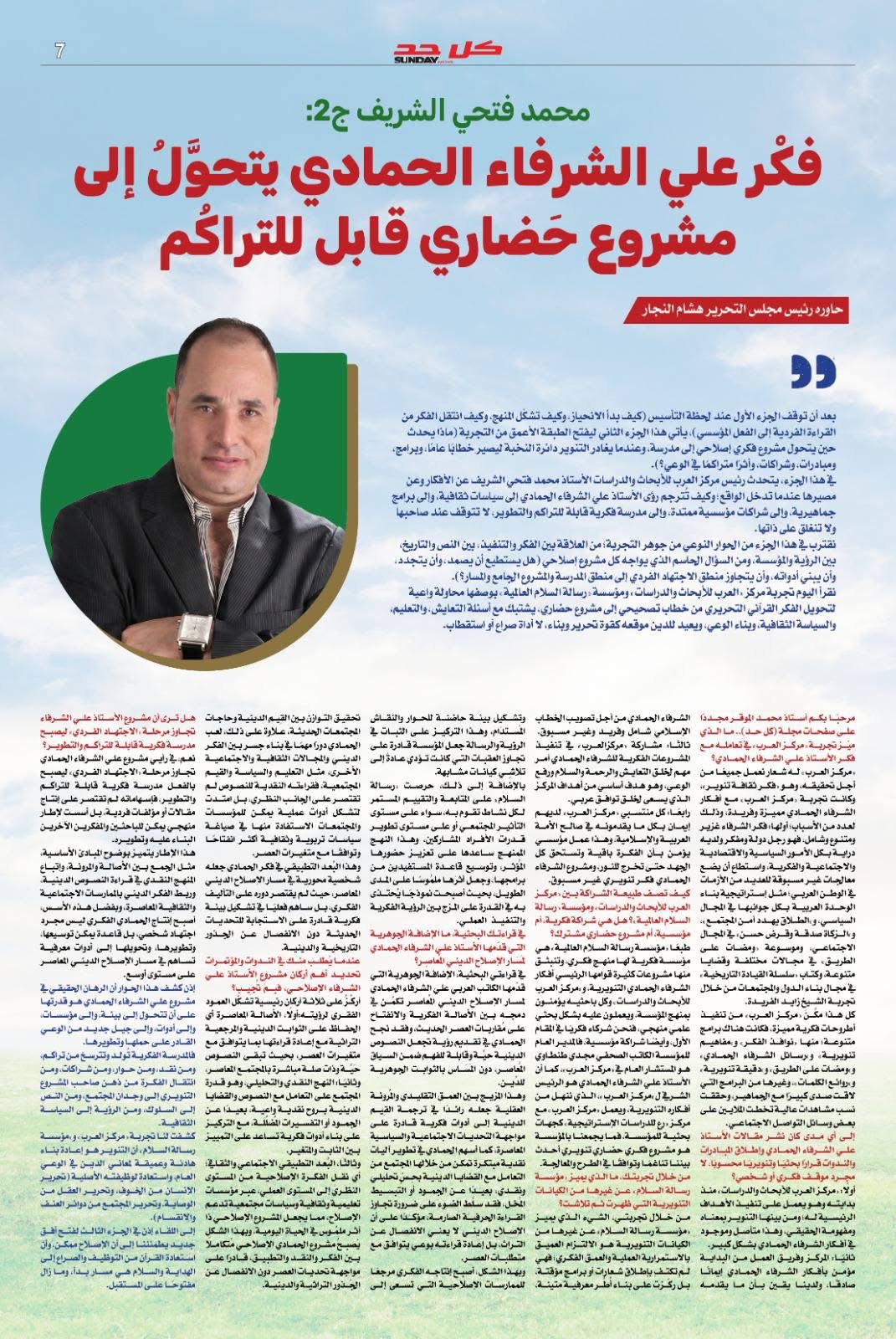 وانفرد العدد بنشر الجزء الثاني من الحوار مع الكاتب الصحفي محمد فتحي الشريف، رئيس مركز العرب للدراسات والأبحاث حيث ناقش الحوار قضايا الفكر والتنوير وتجديد الخطاب الثقافي في العالم العربي .