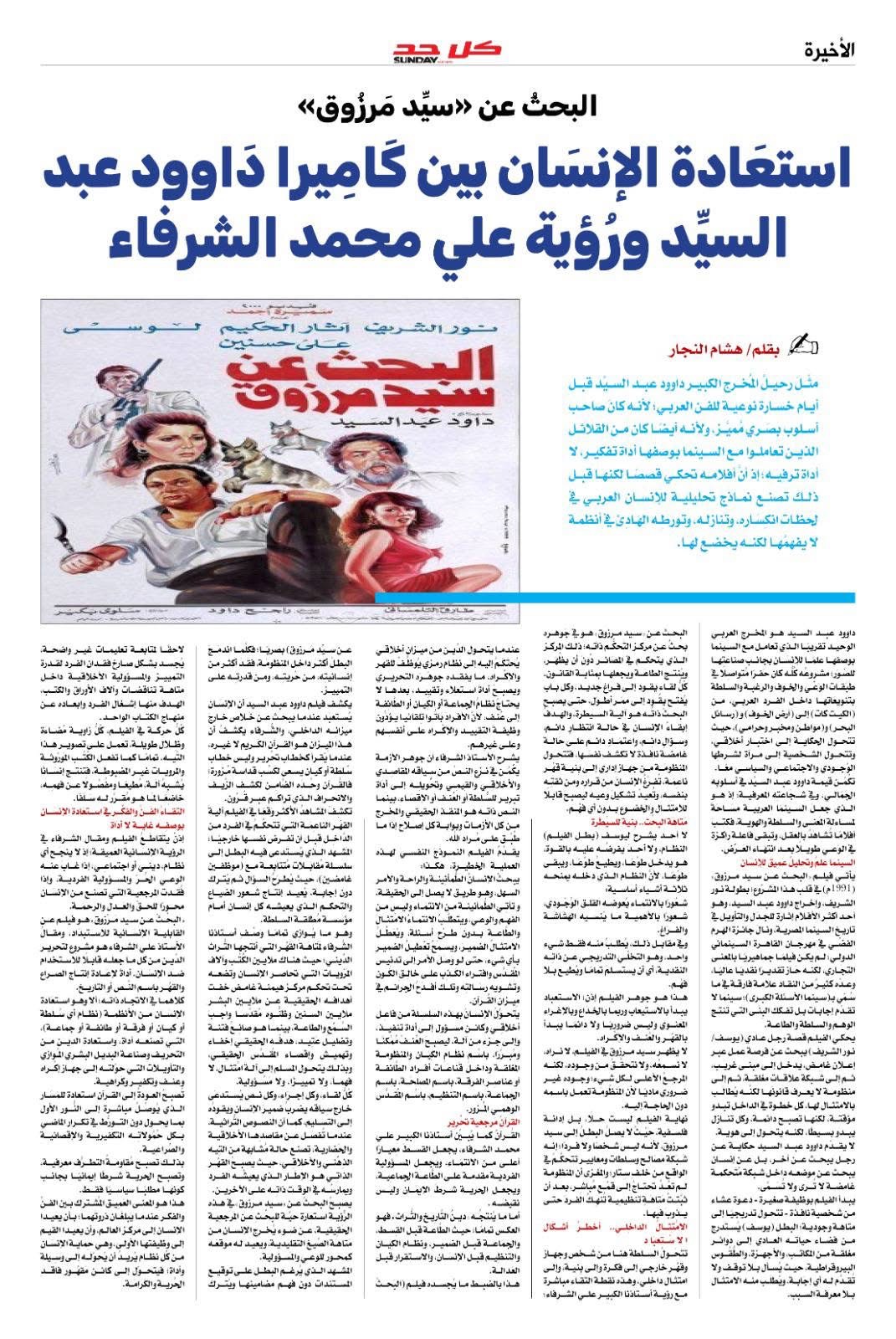وفي الصفحة الأخيرة، التي تشتبك مع المشهد الفني والثقافي، نشر رئيس مجلس تحرير المجلة الكاتب الصحفي هشام النجار مقال تحليلي بعنوان : " البحث عن السيد مرزوق .. استعادة الإنسان بين كاميرا داوود عبد السيد ورؤية علي محمد الشرفاء " ، ربط فيه بين الخطاب السينمائي الإنساني ورؤية الشرفاء الحمادي التي تضع الإنسان في مركز الخطاب الديني والثقافي .