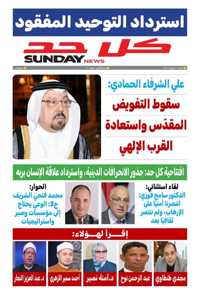 صدر امس الأحد 11 يناير 2026م العدد رقم (62) من مجلة " كل حد " الصادرة عن مؤسسة " رسالة السلام " العالمية حاملاً ملف فكري رئيسي بعنوان " استرداد التوحيد المفقود " في محاولة جادة لإعادة طرح قضايا الإيمان والتدين من منظور تنويري نقدي يعيد الاعتبار لجوهر الرسالة الإلهية بعيد عن التشويه والوساطة البشرية .